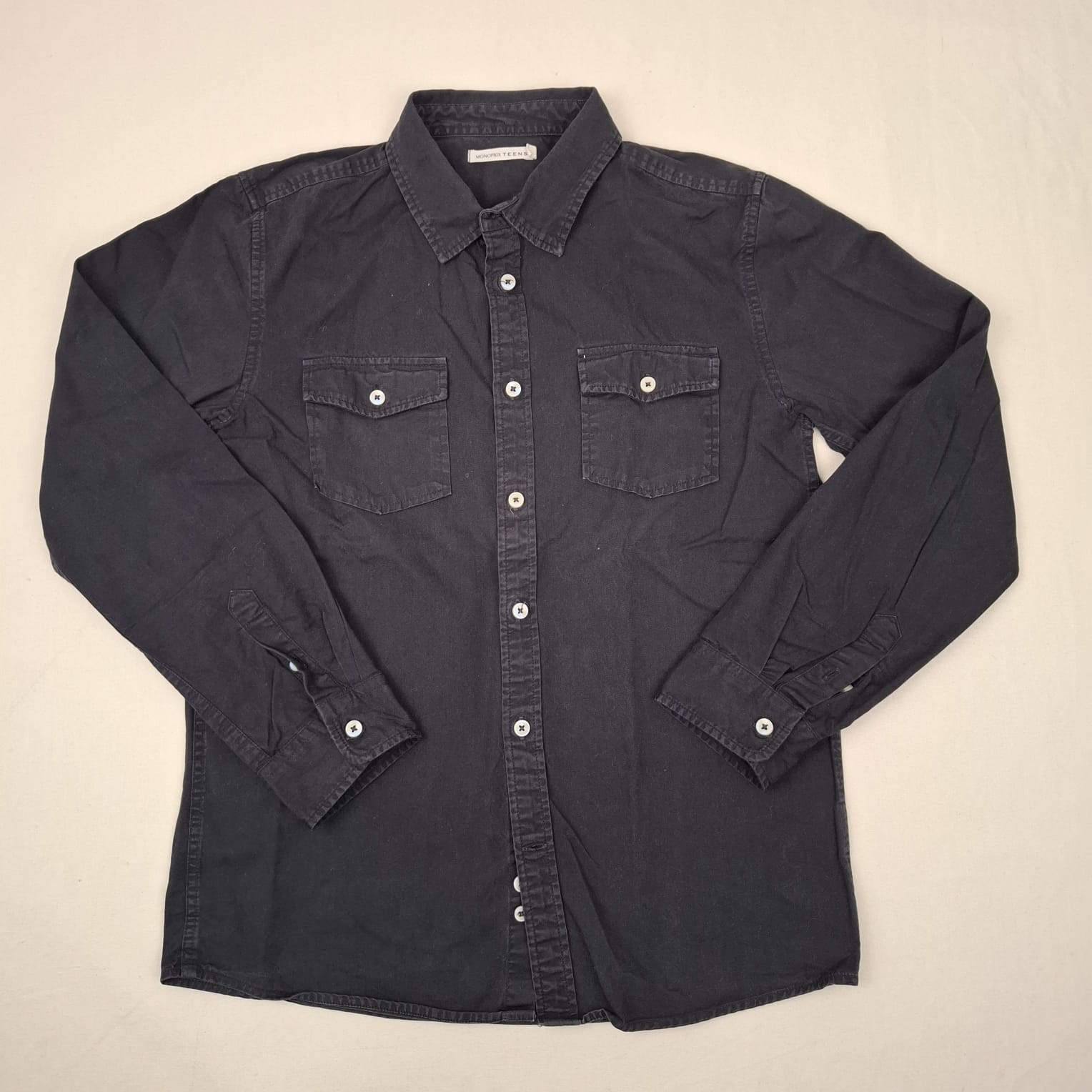 Autres commentaires : Chemise en toile noire à manches longues, fermeture devant et aux poignets par boutons