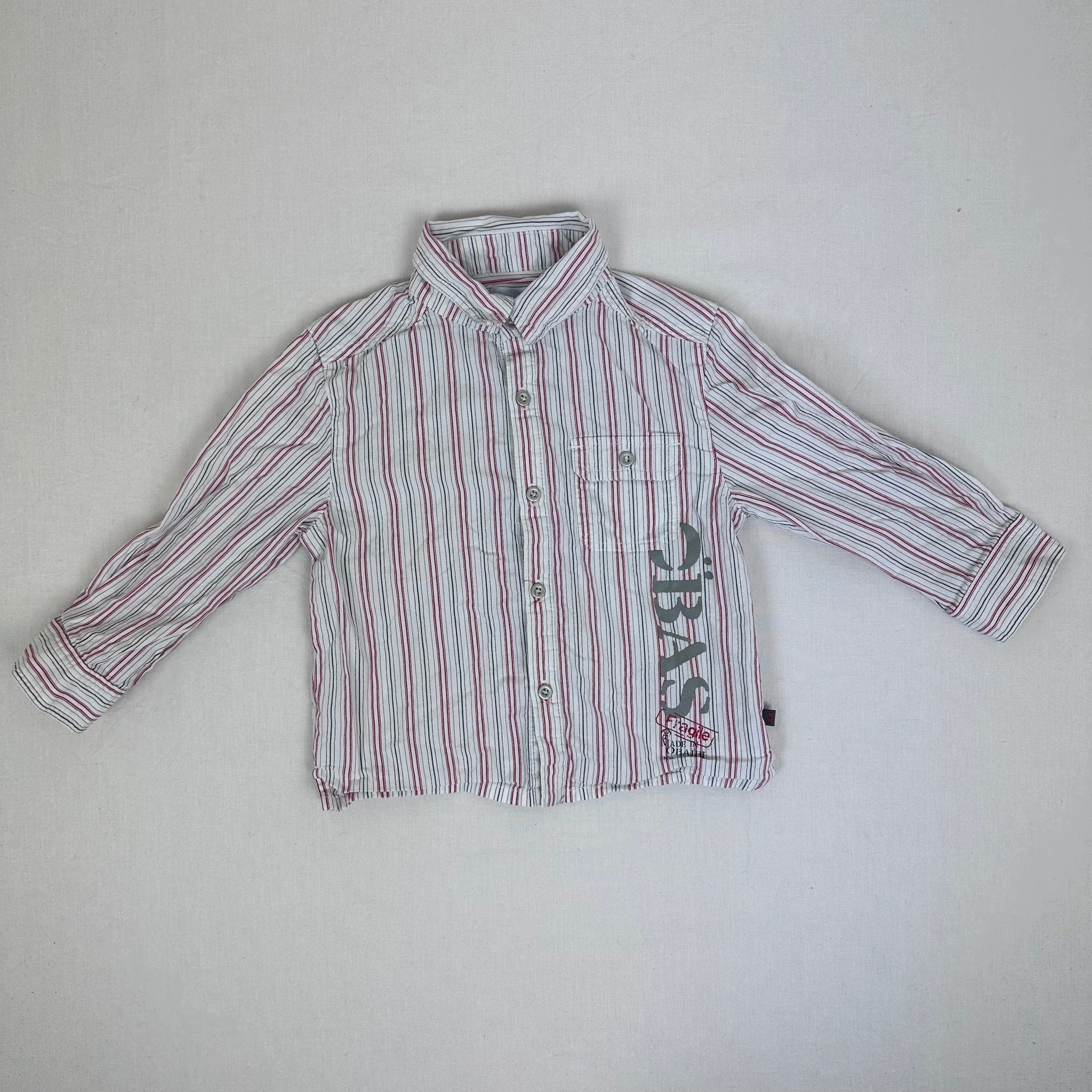 Autres commentaires : Chemise blanche avec des rayures fines noires, rouge et vert avec une fermeture par bouton.