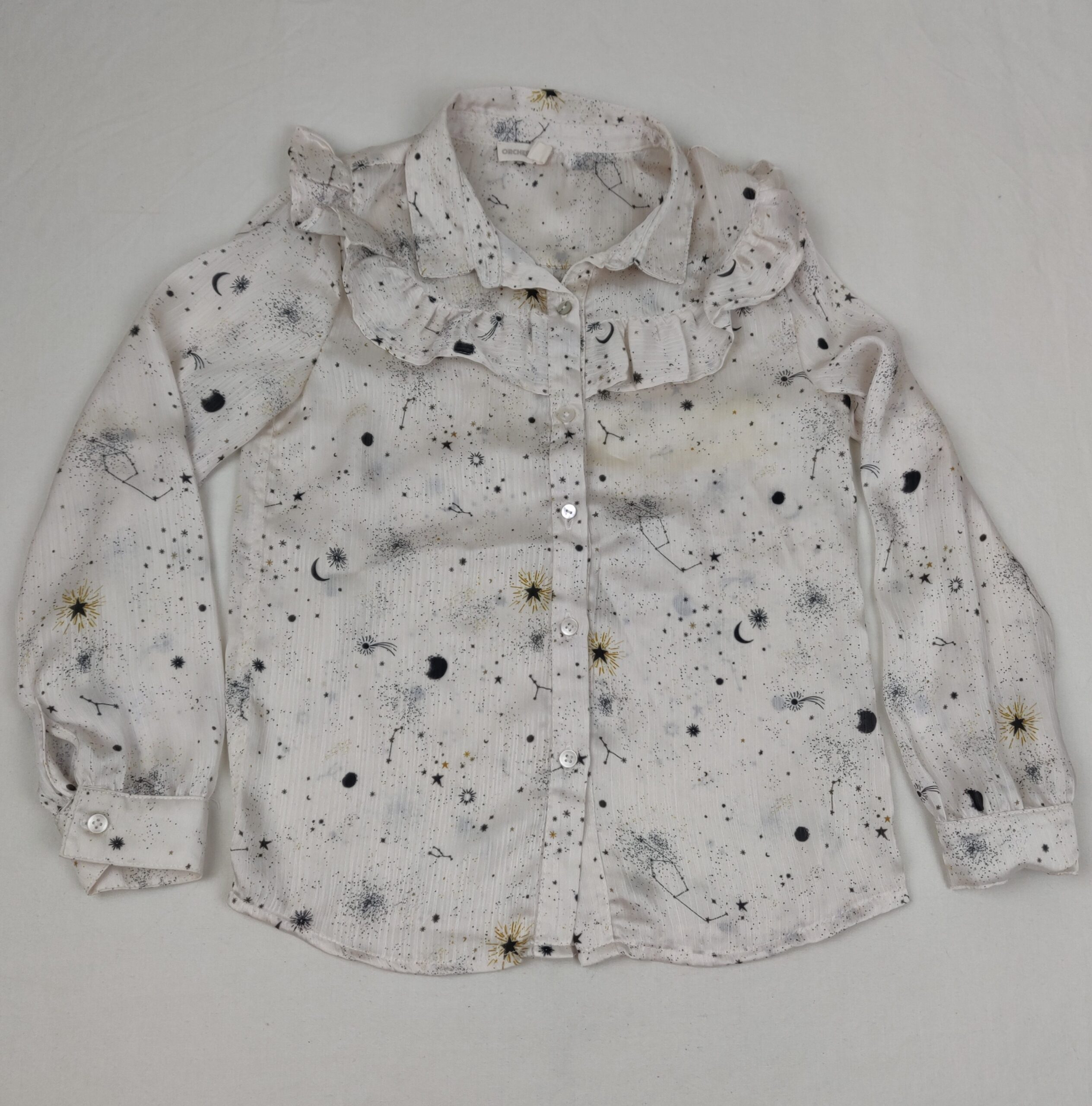 Autres commentaires : Chemisier de fête, fluide et légèrement transparent, fines rayures en relief dans le tisuu, blanc cassé avec lune et constellations bleu nuit et dorées, col chemise, volant au niveau poitrine et épaules, pli fluide au milieu du dos