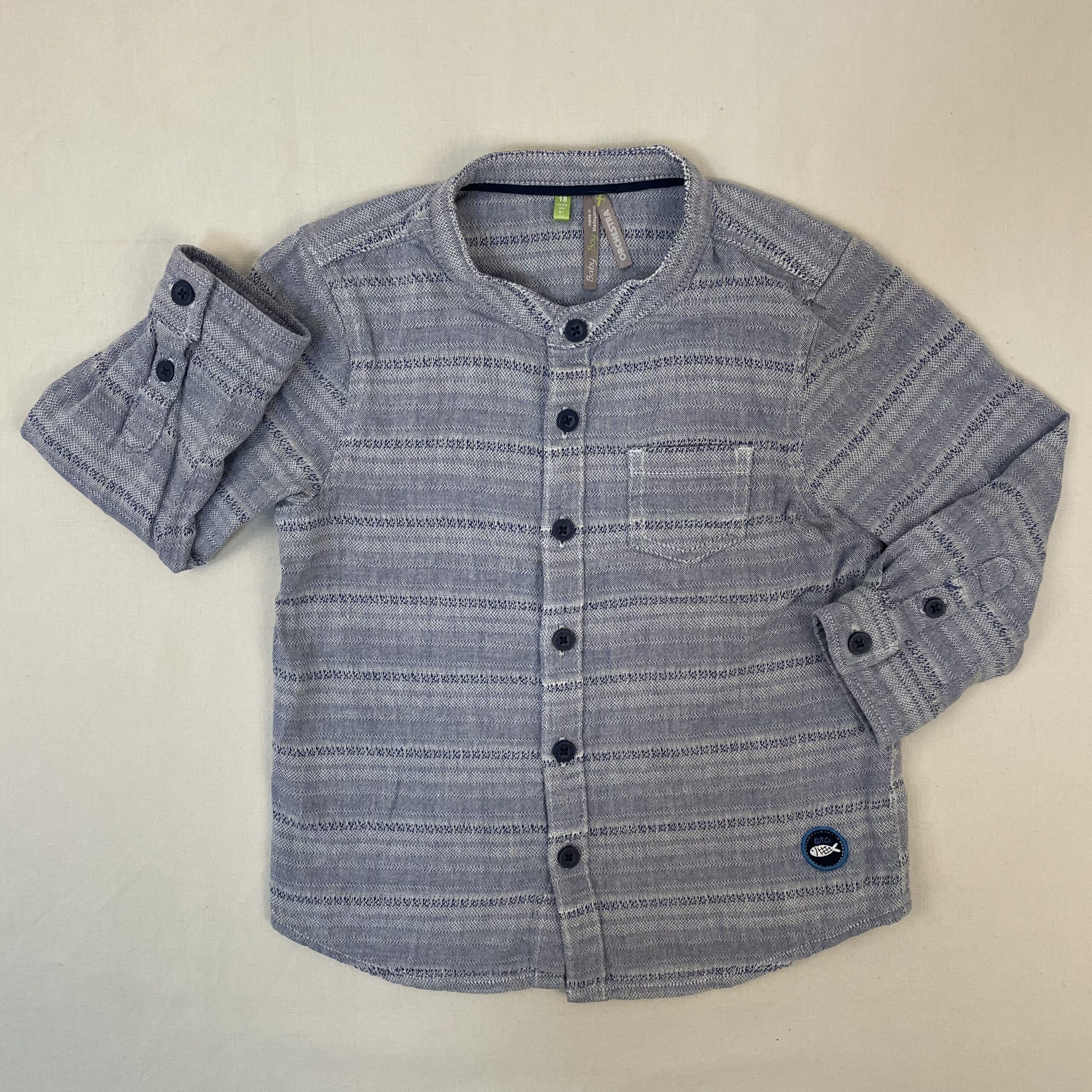 - Chemise manches longues retroussables par petit bouton, motifs bandes bleutées, fermeture devant par boutons classiques.