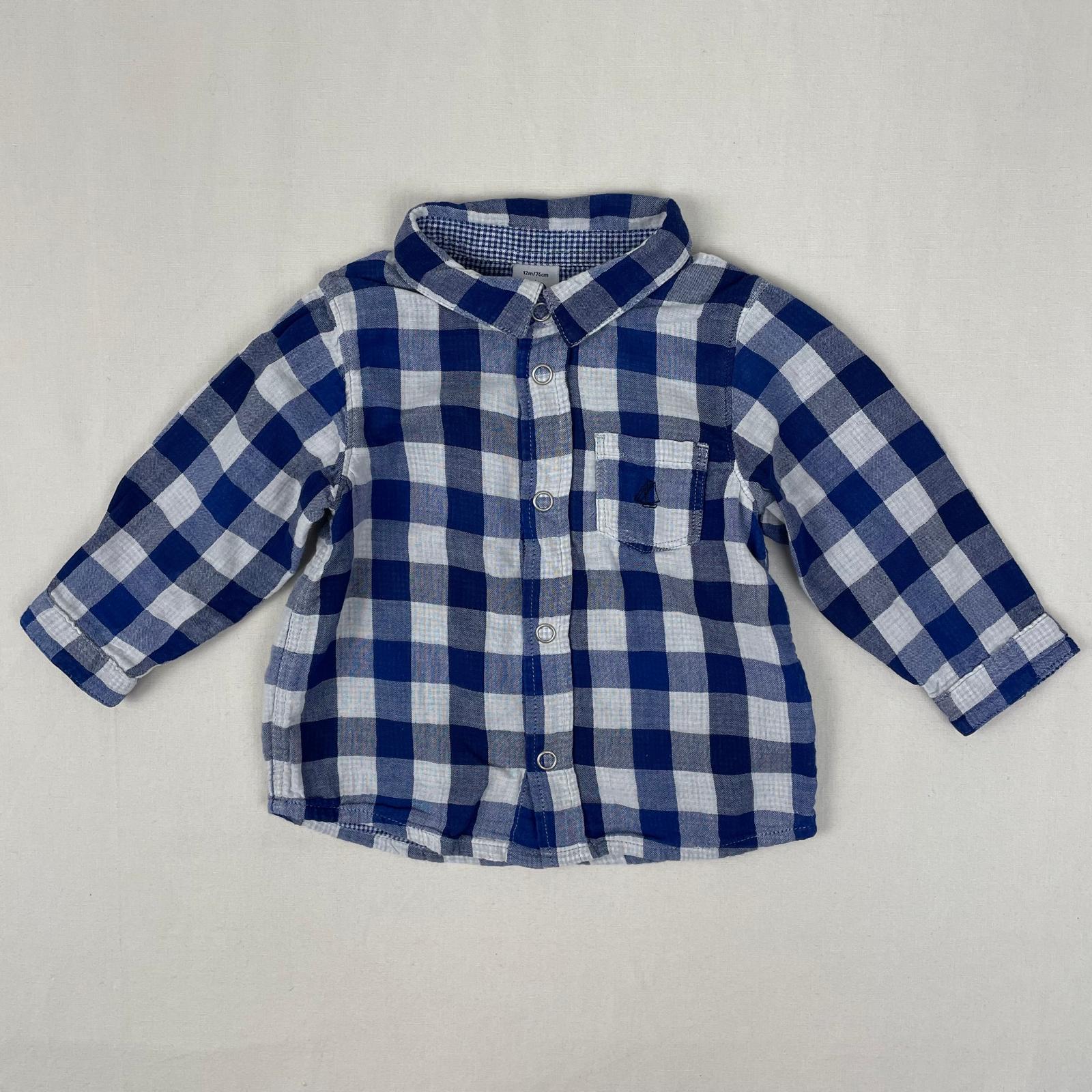 Chemise à carreaux bleus et blancs, fermeture par boutons pression, avec une poche côté coeur brodée d’un petit bateau.