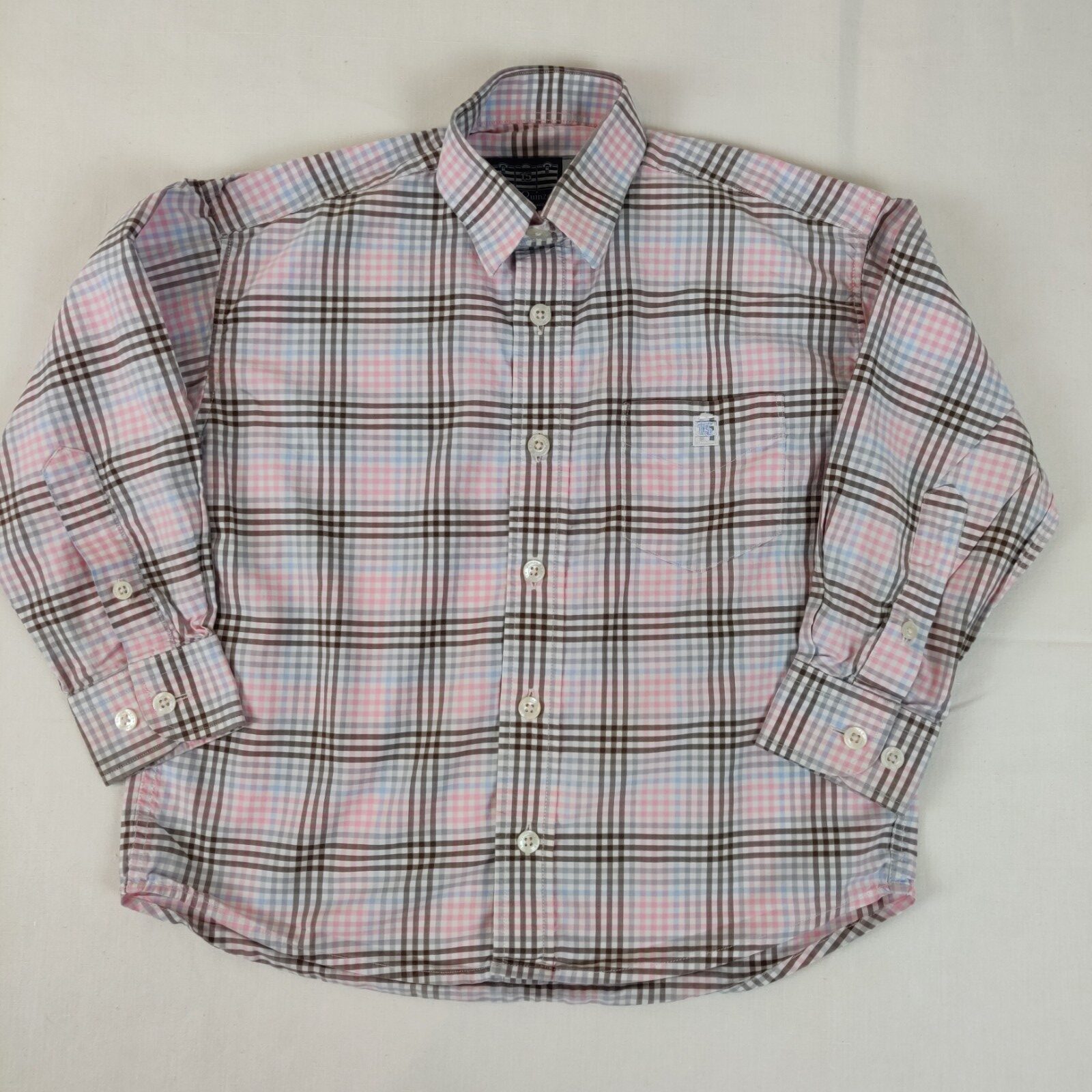 Autres commentaires : Chemise manche longues – quadrillage marron, rose, bleu et gris – ouverture centrale à boutons classiques (1 bouton supplémentaire fourni). Une pochette centrale avec logo de la marque cousu. 3 boutons sur les manches. Inscription « 15 Rugby » cousue en fil bleu clair au dos.