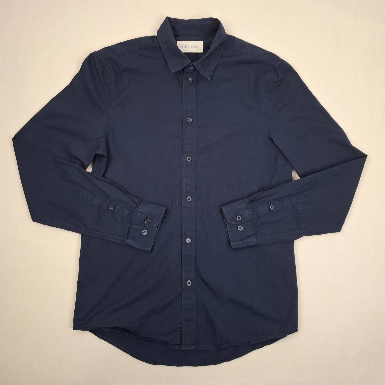 Autres commentaires : Chemise unie gris-bleu foncé à manches longues, taille XS.