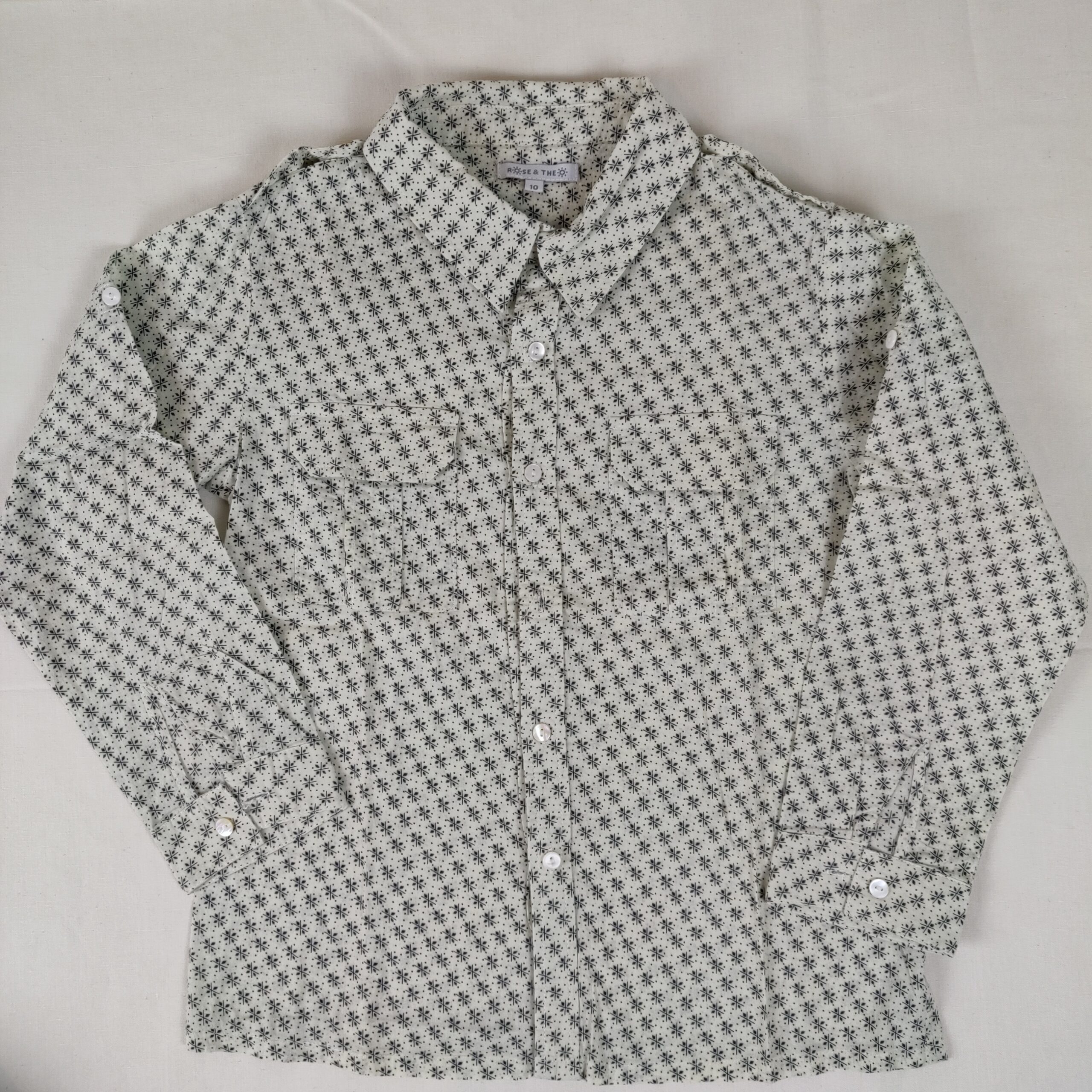 Autres commentaires : Chemise à manches longues, blanche à motifs étoilés noirs. Manches retroussables.