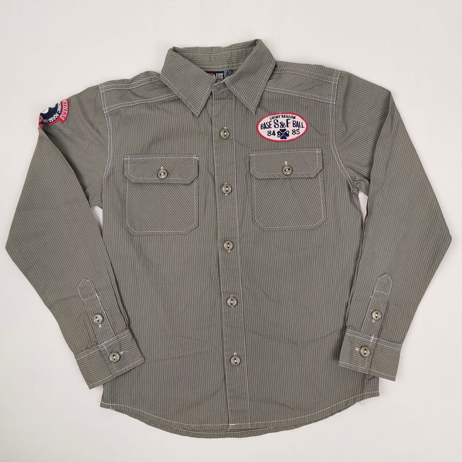 Autres commentaires : Chemise manches longues vert kaki rayé blan, patch à l’avant et sur la manche droite, poches avant