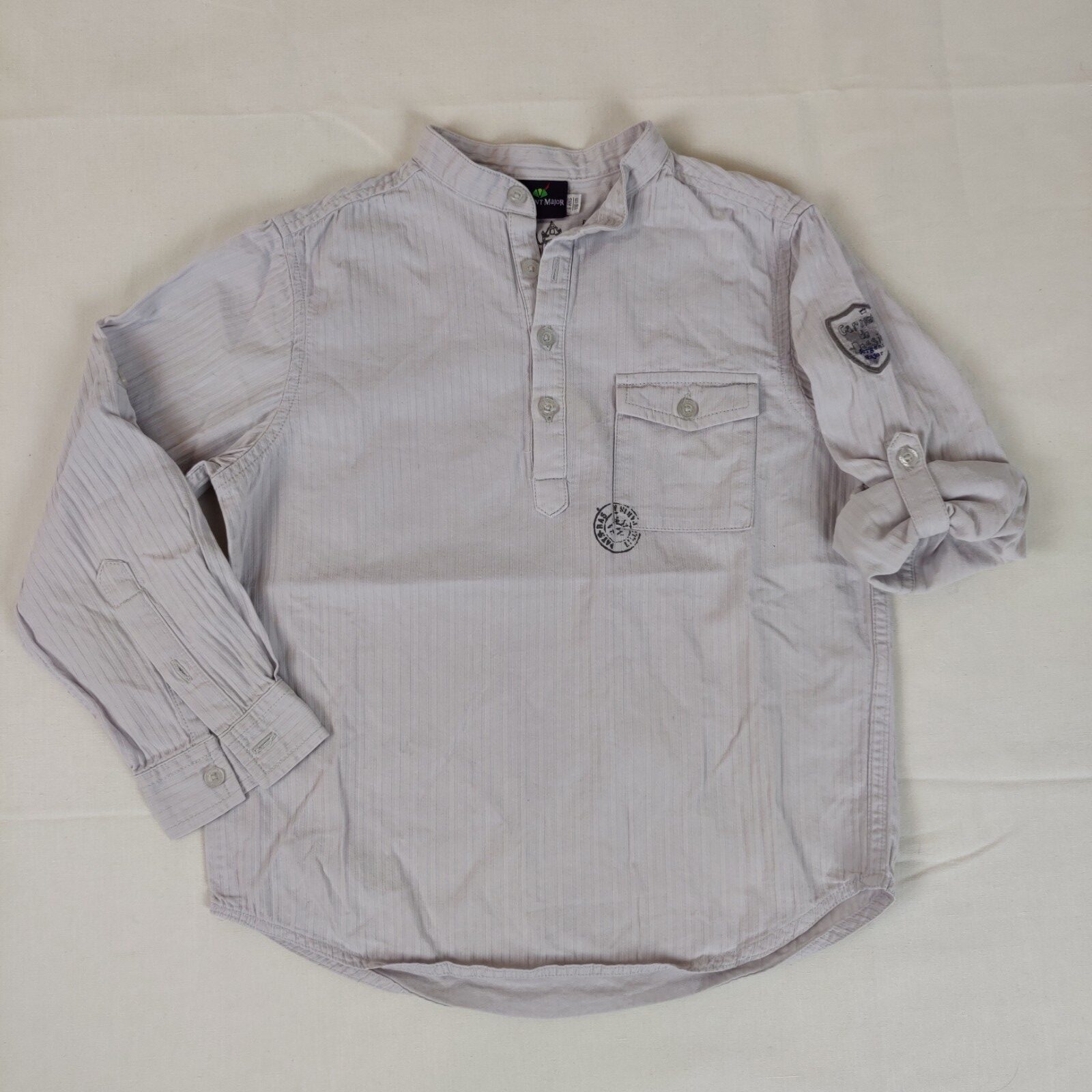 Autres commentaires : Chemise à manches longues – blanc-gris clair avec de fines rayures verticales en relief. Pochette centrale avec motif tampon gris foncé. Ecusson cousu sur la manche gauche « Carnet de dessin ». Ouverture centrale à 4 boutons classiques nacrés. Manches retroussables et attachables. Inscription gris foncé à l’arrière près de la taille « Voyage d’artiste ». Très discrète tâche marron au devant du vêtement.