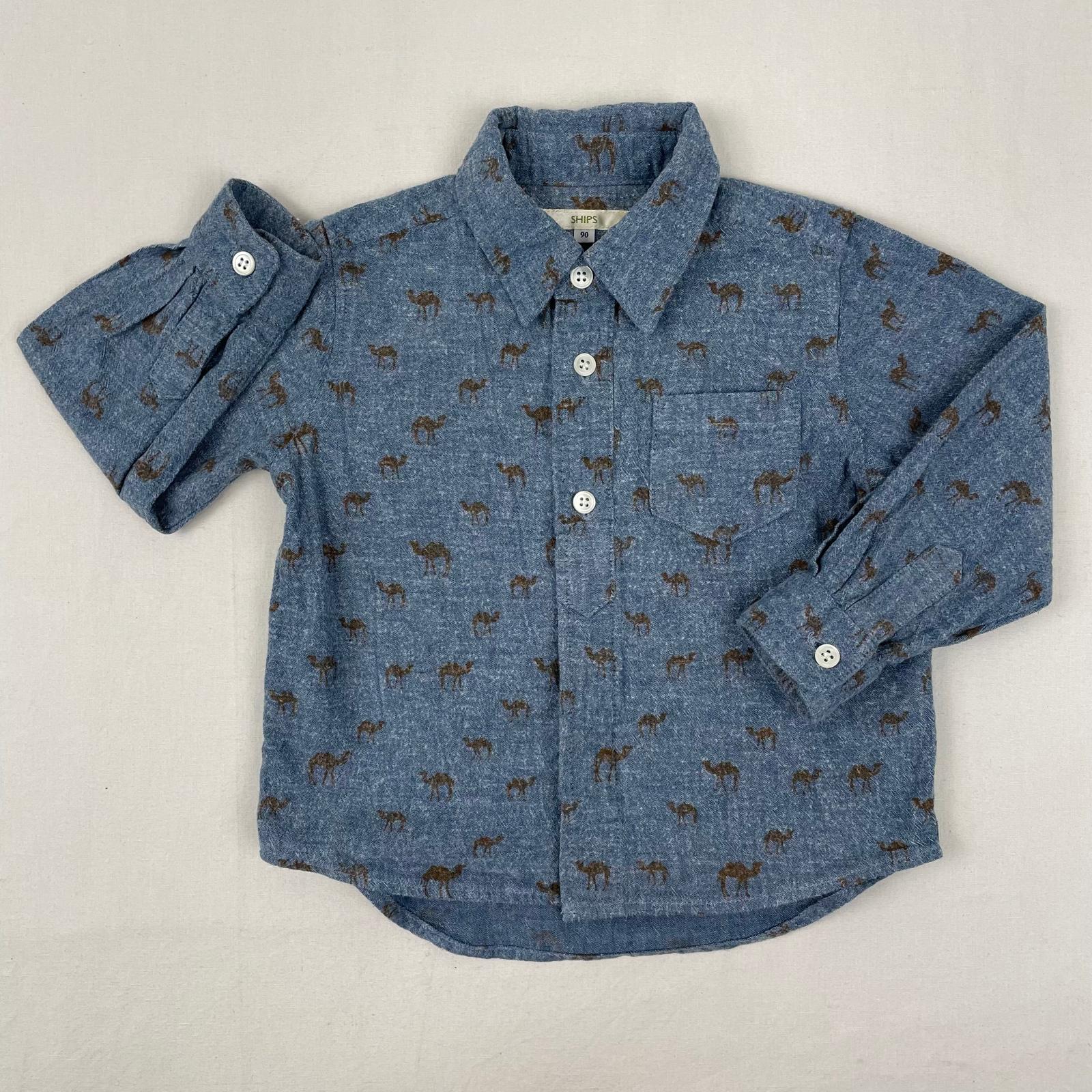Chemise manches longues en denim, fermeture par boutons classiques, motif parsemé de chameaux bruns.