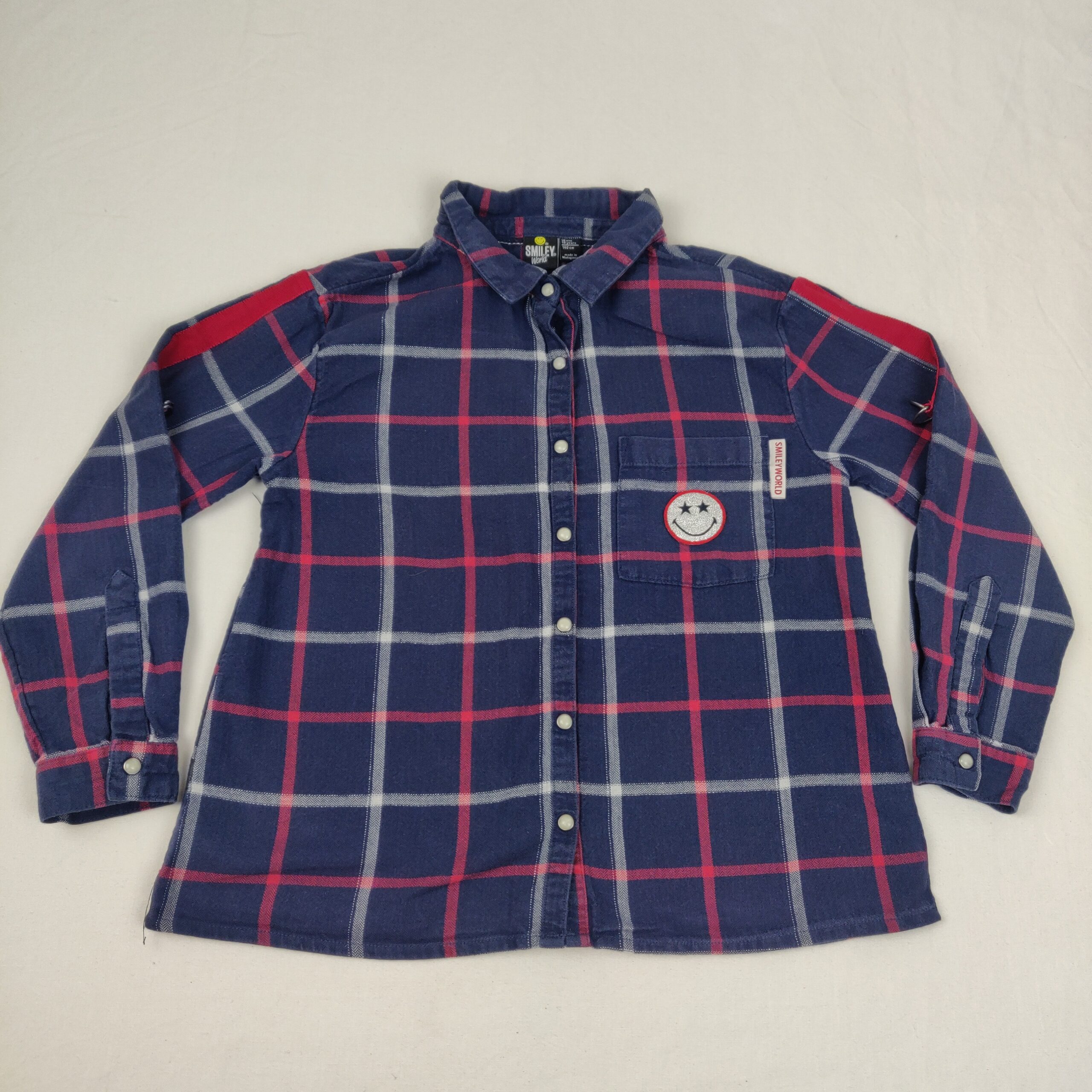 Autres commentaires : Chemise à manches longues, en tissu un peu épais, bleu foncé à carreaux rouge framboise et blancs, parsemé de fils argentés, fermeture par boutons pression style nacrés,motif smiley sctintillant en relief sur la poche devant, possibilté de retrousser les manches avec un sytéme d’attache coulissant