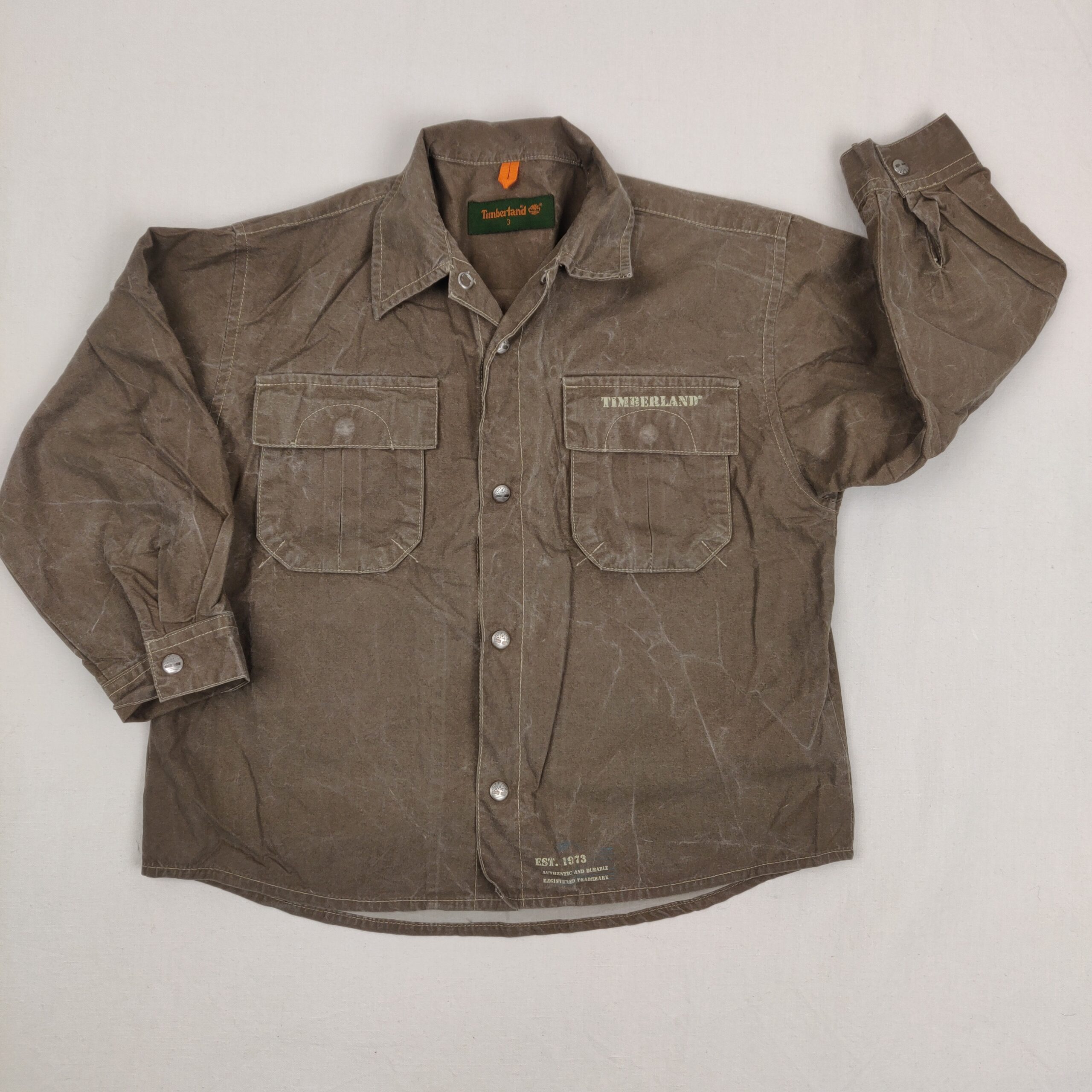Autres commentaires : 5% polyuréthane – Chemise kaki à manches longues, fermeture devant et manches par boutons pression, poches à rabat avec boutons pression, motif étiquette beige en relief en haut du dos avec rappel de la marque Timberland.