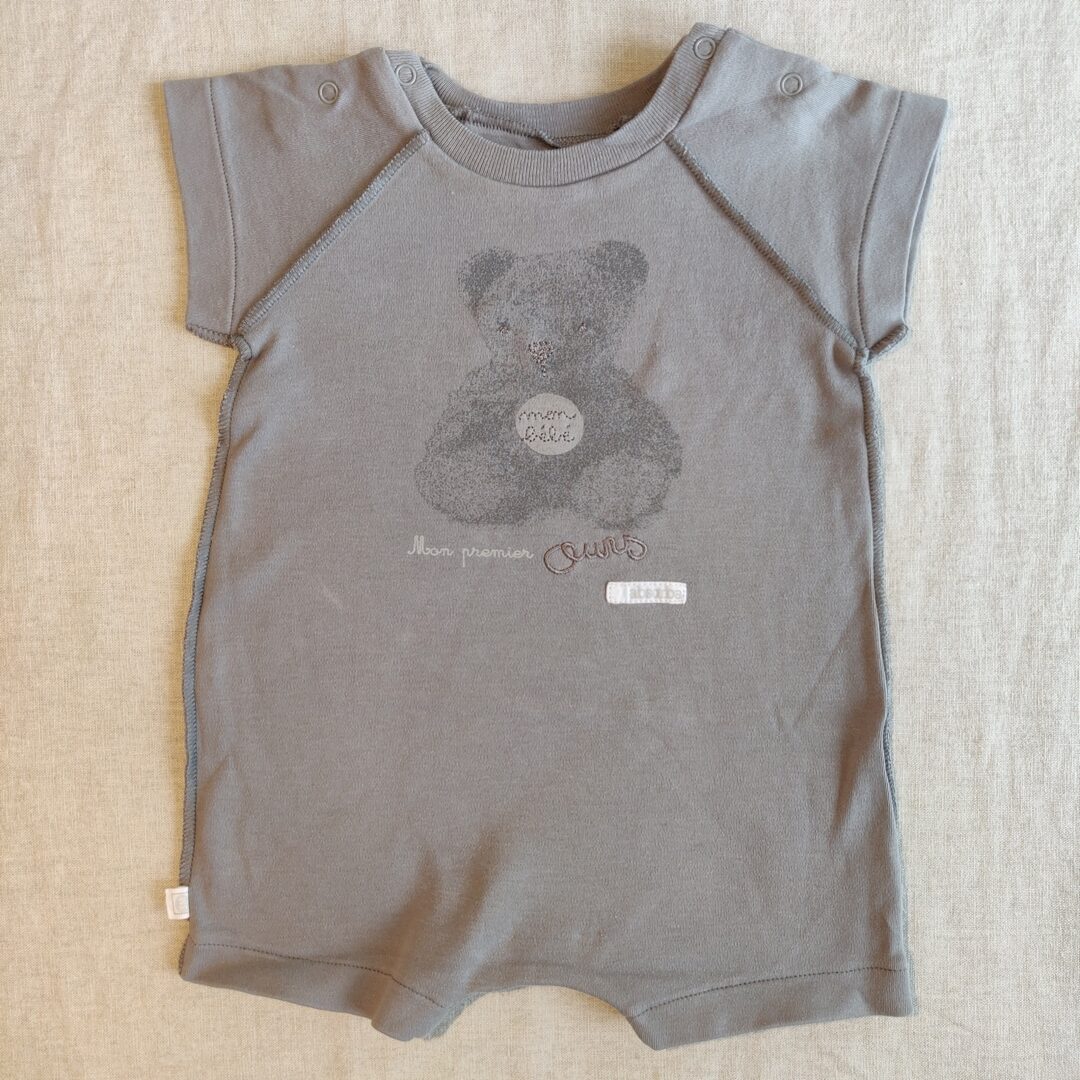 Autres commentaires : Coton bio. Combinaison short gris, col rond à manches courtes, fermeture par 2 boutons pression à chaque épaule et 4 à l’entrejambe. Inscription « Mon bébé, mon premier ours » brodée et dessin d’ours ton sur ton.