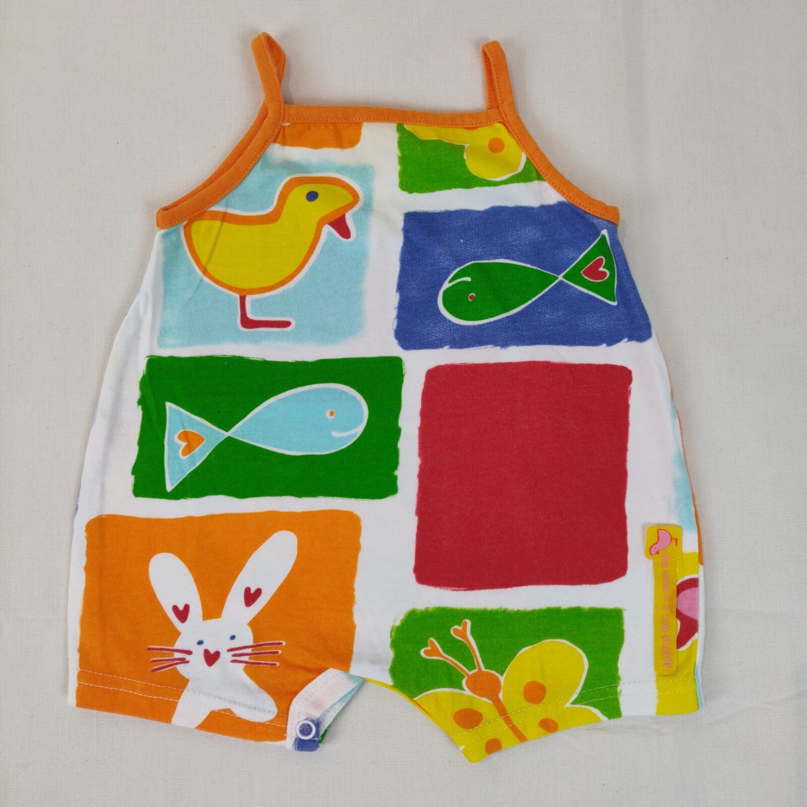 Autres commentaires : Combicourt à fines bretelles oranges – blanc à motifs carrés colorés décorés d’animaux. Ouverture à l’entre-jambe à boutons pression.