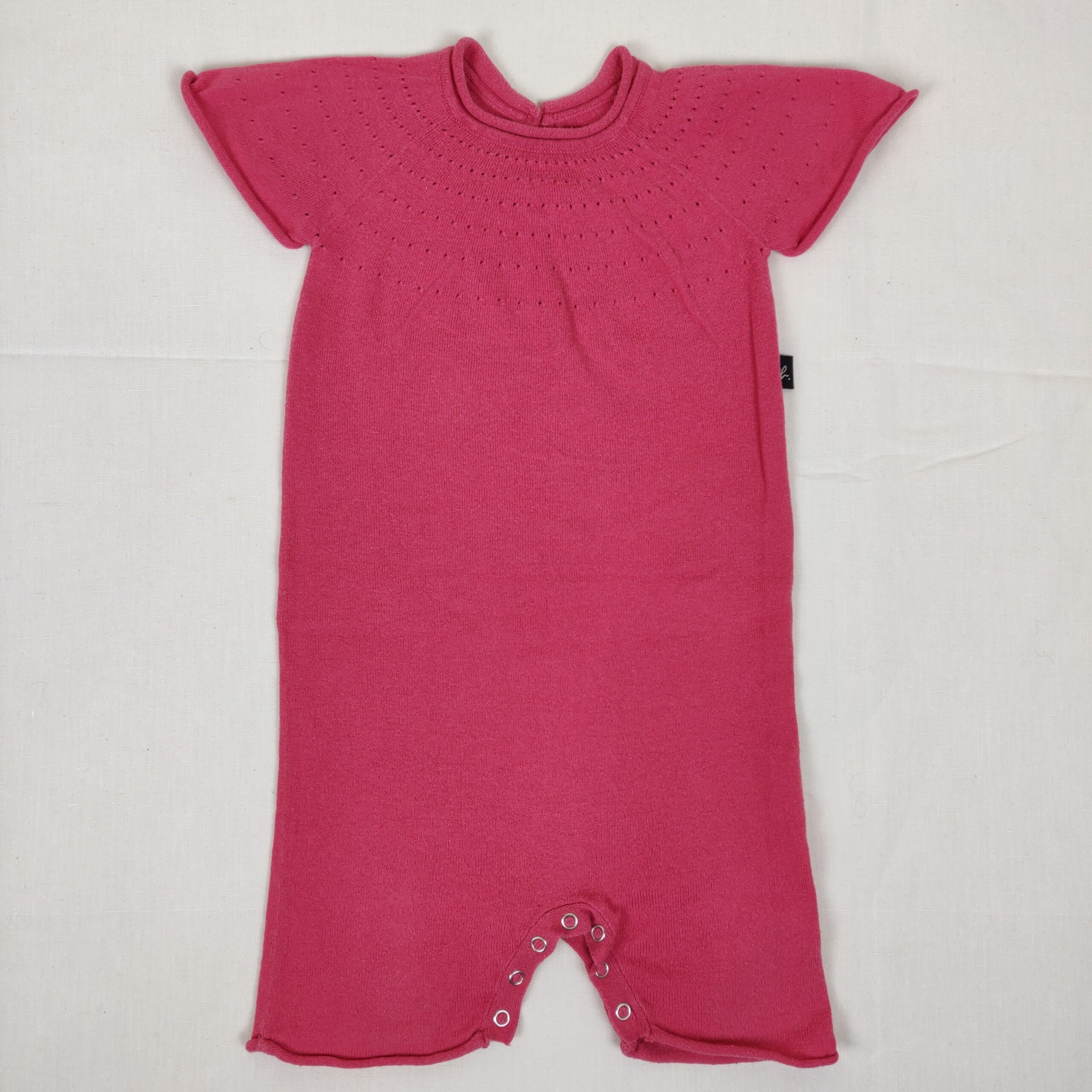 Autres commentaires : Combicourt en maille de coton ajourée au plastron. Manches courtes, fermeture par un bouton au dos et des boutons pression à l’entrejambe