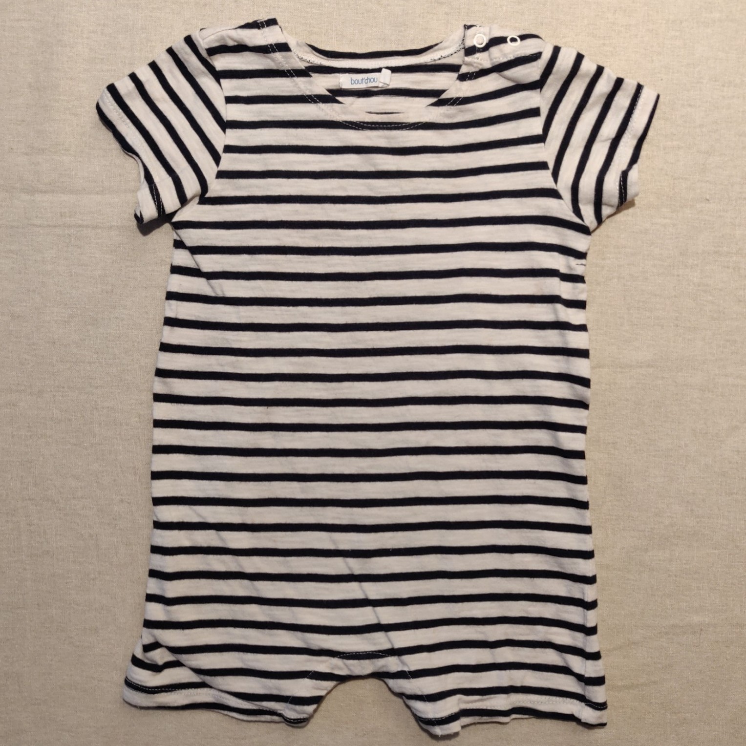 Autres commentaires : Barboteuse marinière blanc et bleu marine. Fermeture à l’épaule gauche et à l’entrejambe par boutons pression. Le blanc est grisalleux.