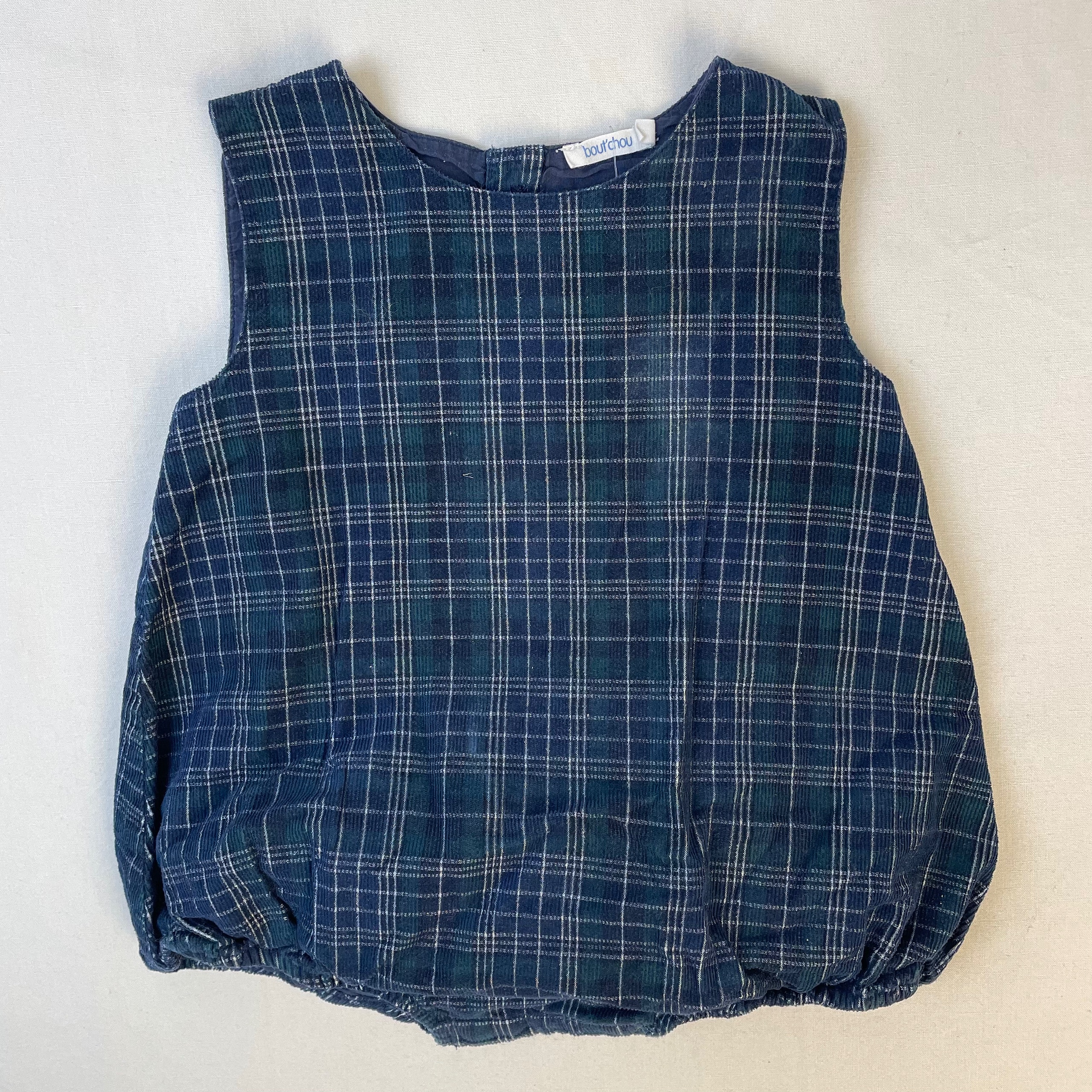 - Combicourt à carreaux sans manches, fermeture par boutons classiques au dos, bas élastiques.