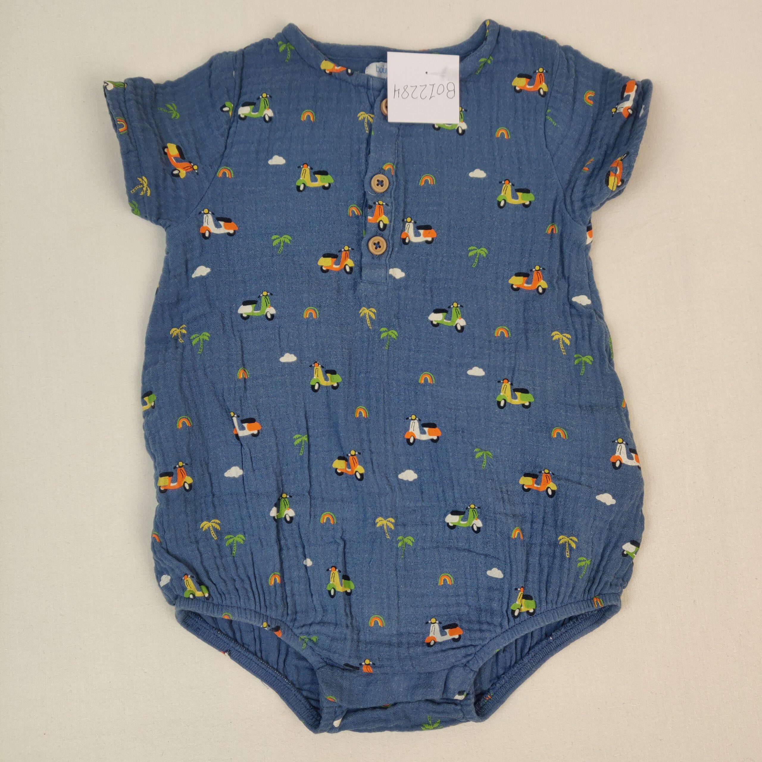 Autres commentaires : Combicourt manches courtes bleu ardoise, partie short très courte, col rond, motifs mulicolores : scooters, palmiers et arc-en-ciel, fermeture par boutons à l’avant.