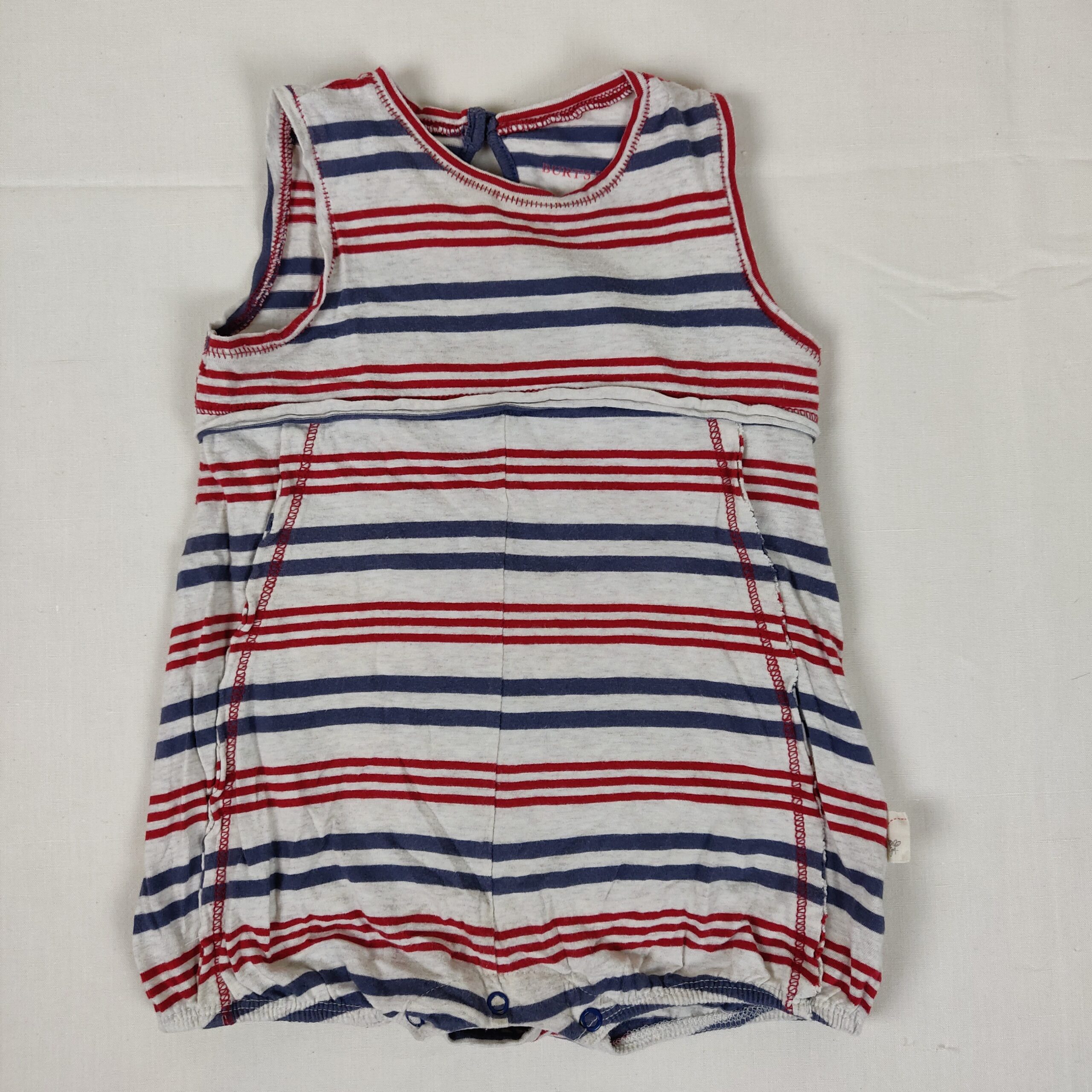 Autres commentaires : Coton organique. Barboteuse grise à rayures rouges et bleues. Fermeture par un bouton au dos et boutons pression à l’entrejambe.