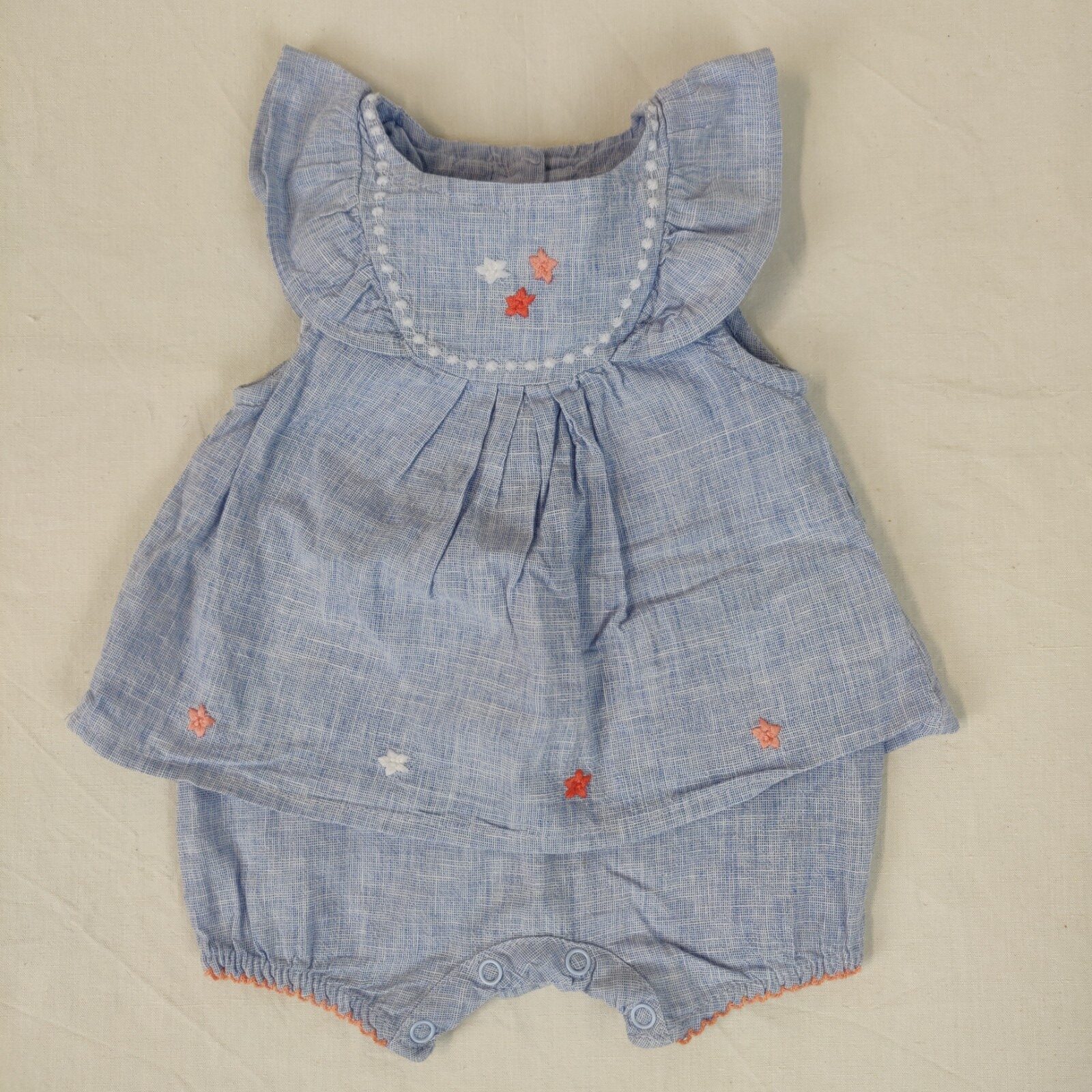 Autres commentaires : 45% coton. Combicourt composé d’une tunique associée à un bloomer – bleu clair avec des motifs brodés étoiles blanches, oranges et roses. Les manches courtes sont volantées. Ouverture centrale au dos à boutons et à l’entrejambe à pressions.