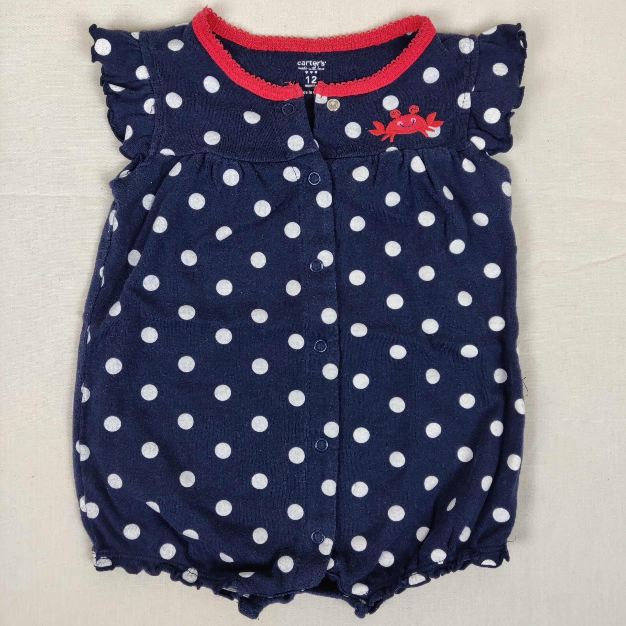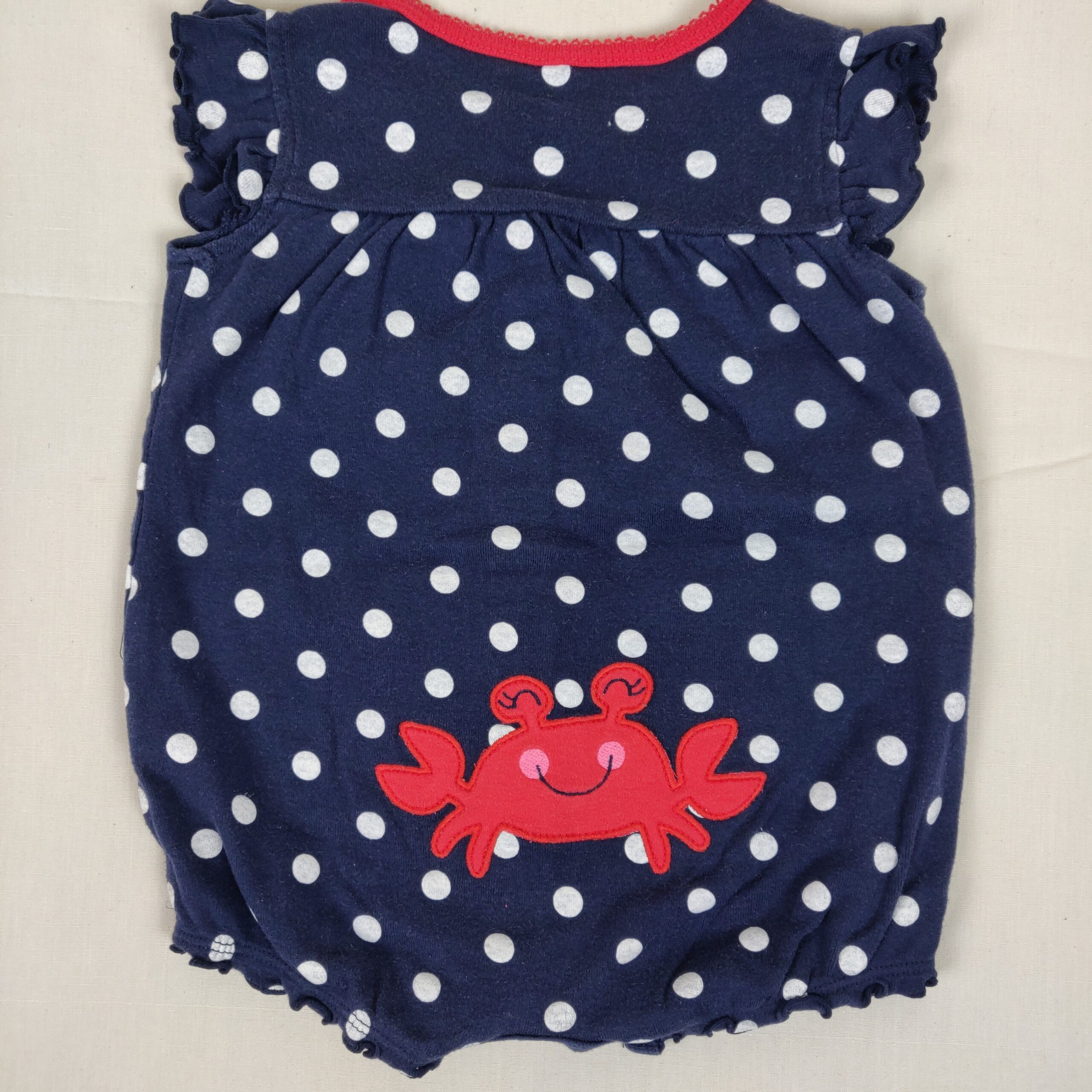 Autres commentaires : Combicourt en jersey de coton épais bleu marine à pois blancs, fermé par boutons pression à l’avant et à l’entrejambe. Crabe rouge brodé à l’avant au coeur, et à l’arrière au fessier.
