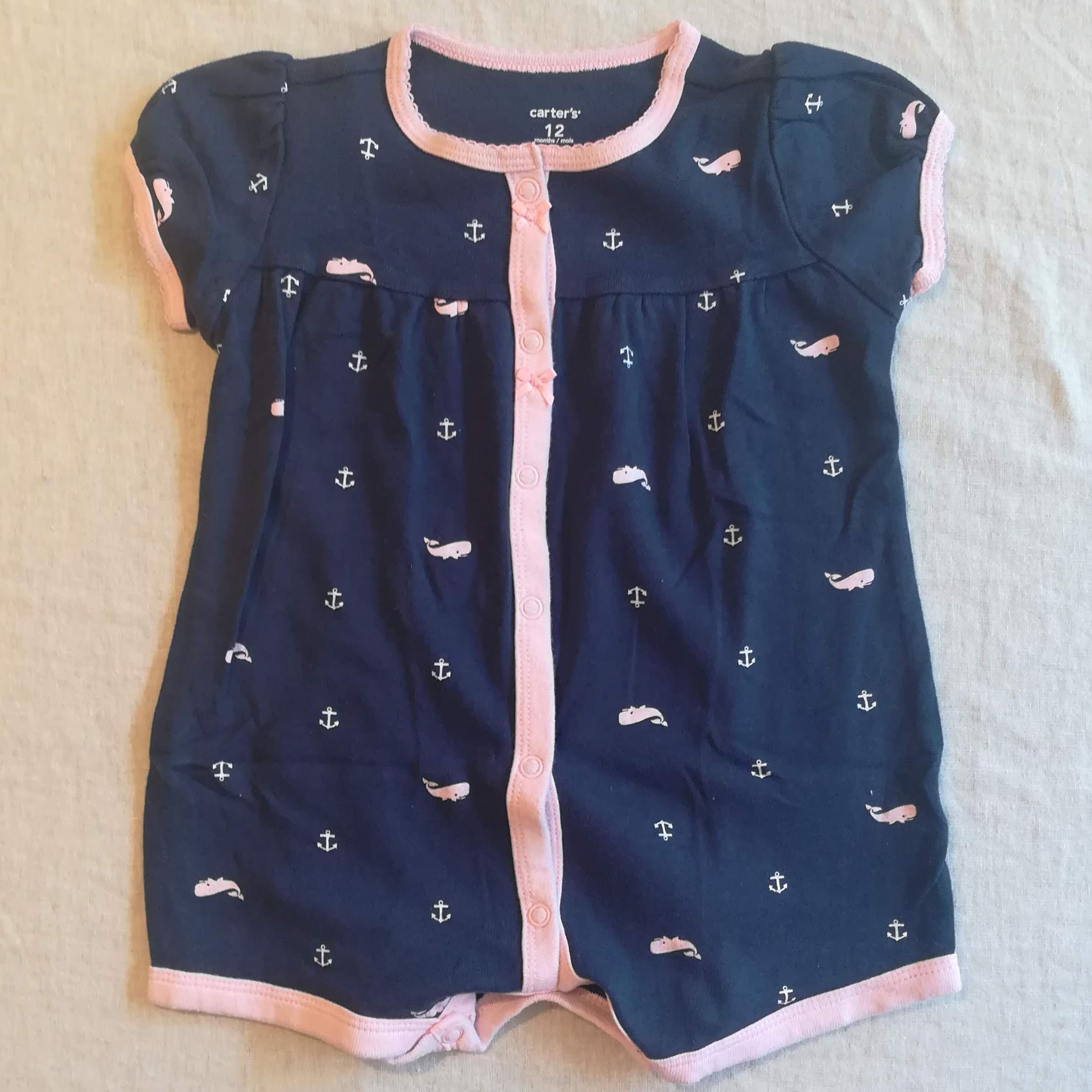 Autres commentaires : Combi-short bleu foncé avec motifs baleines roses / ancres et boutons à pression