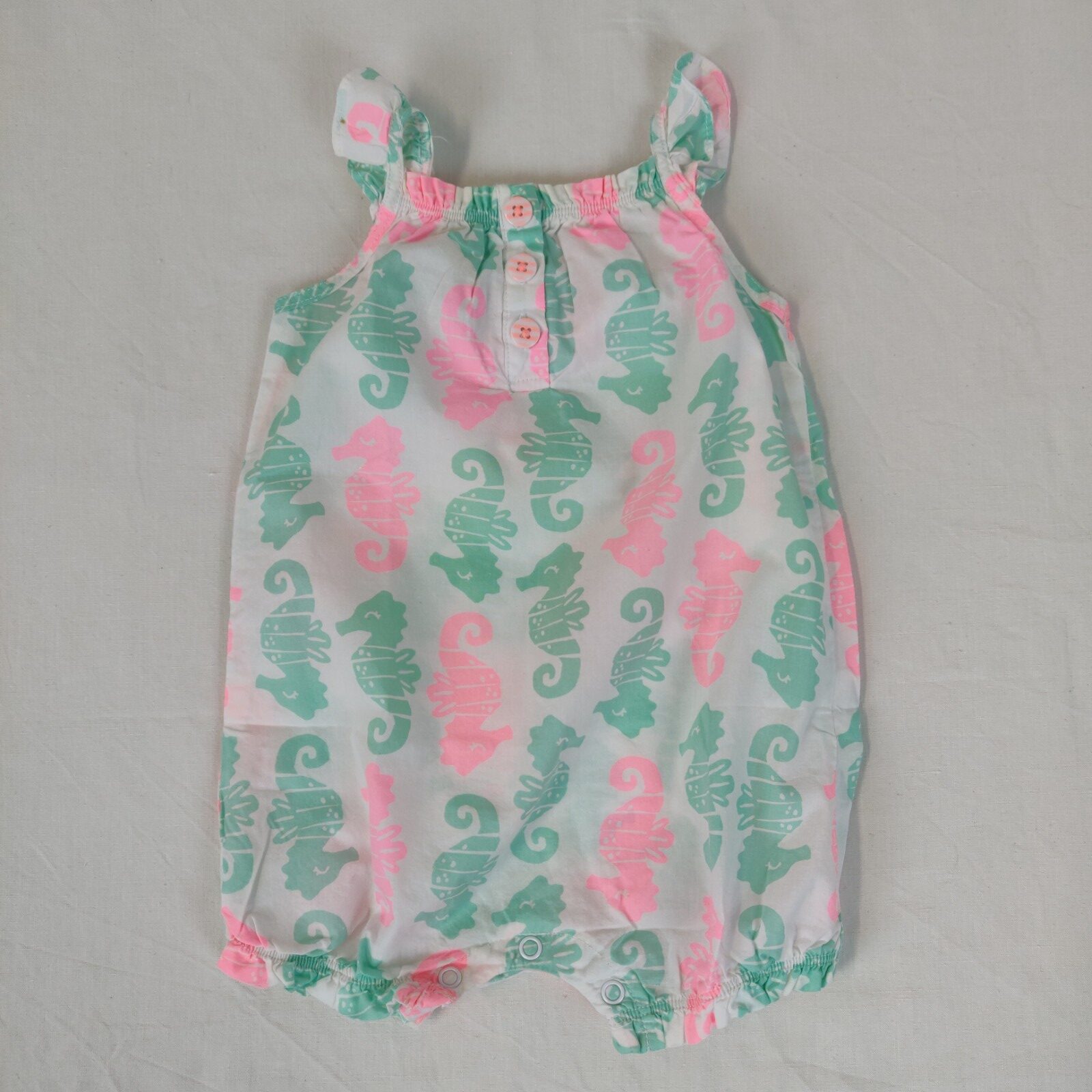 Autres commentaires : Combicourt à bretelles froncées – blanc à motifs roses et verts hippocampes. Ouverture centrale à 3 boutons. Ouverture à l’entrejambe à pressions.