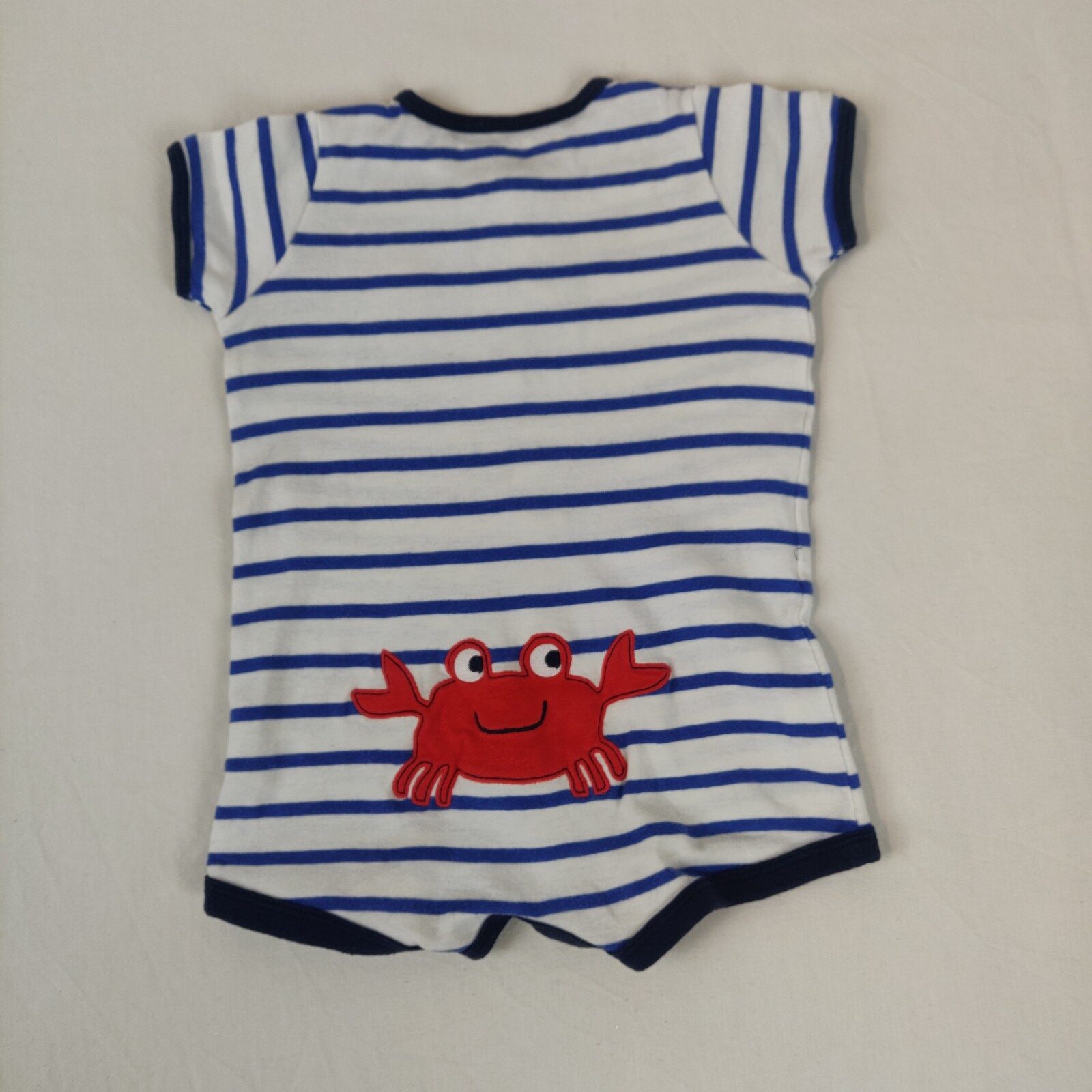 Autres commentaires : Combicourt blanc rayé bleu. Motif central cousu crabe rouge accompagné de l’inscription « Pinch me (I’m cute) ». Ouverture centrale pressionnée. Motif crabe rouge au dos. Usure normale.