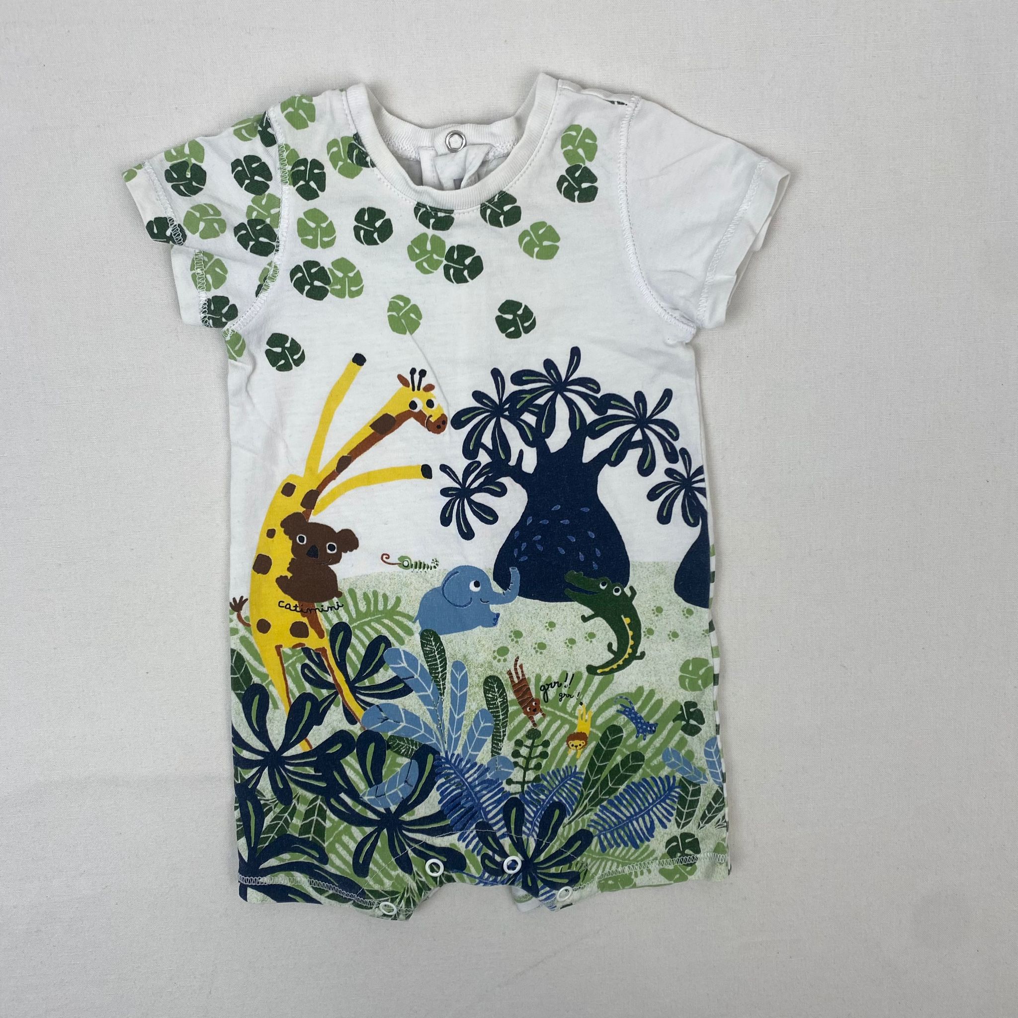 Autres commentaires : Combicourt Catimini blanc à manches courtes avec une représentation de la jungle, fermeture au dos et à l’entrejambe par boutons pression.