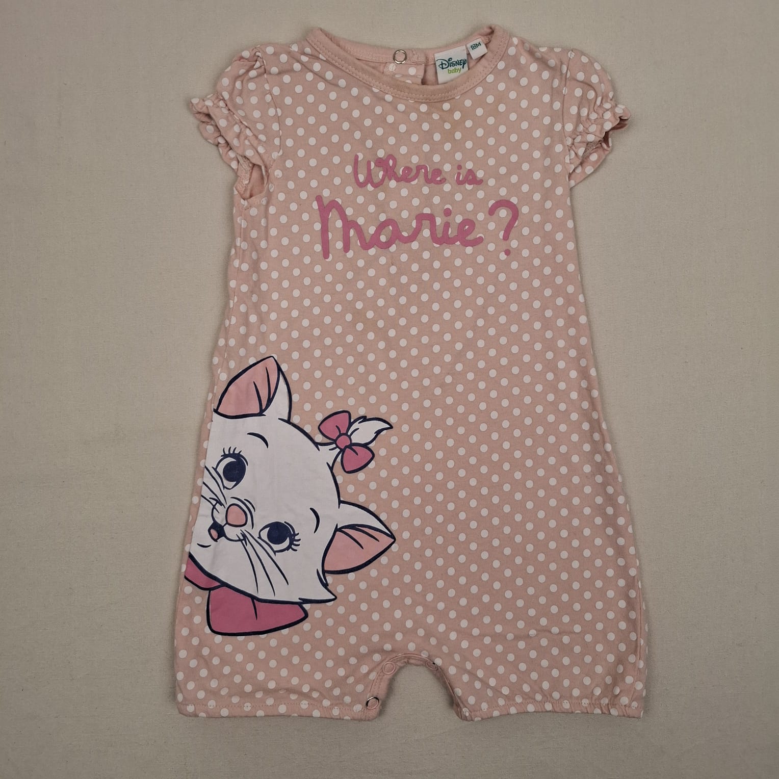 Autres commentaires : Combishort rose clair à pois blanc à manches courtes, motif Marie Disney et inscription « Where is Marie? », col rond, fermeture par boutons pression au dos.