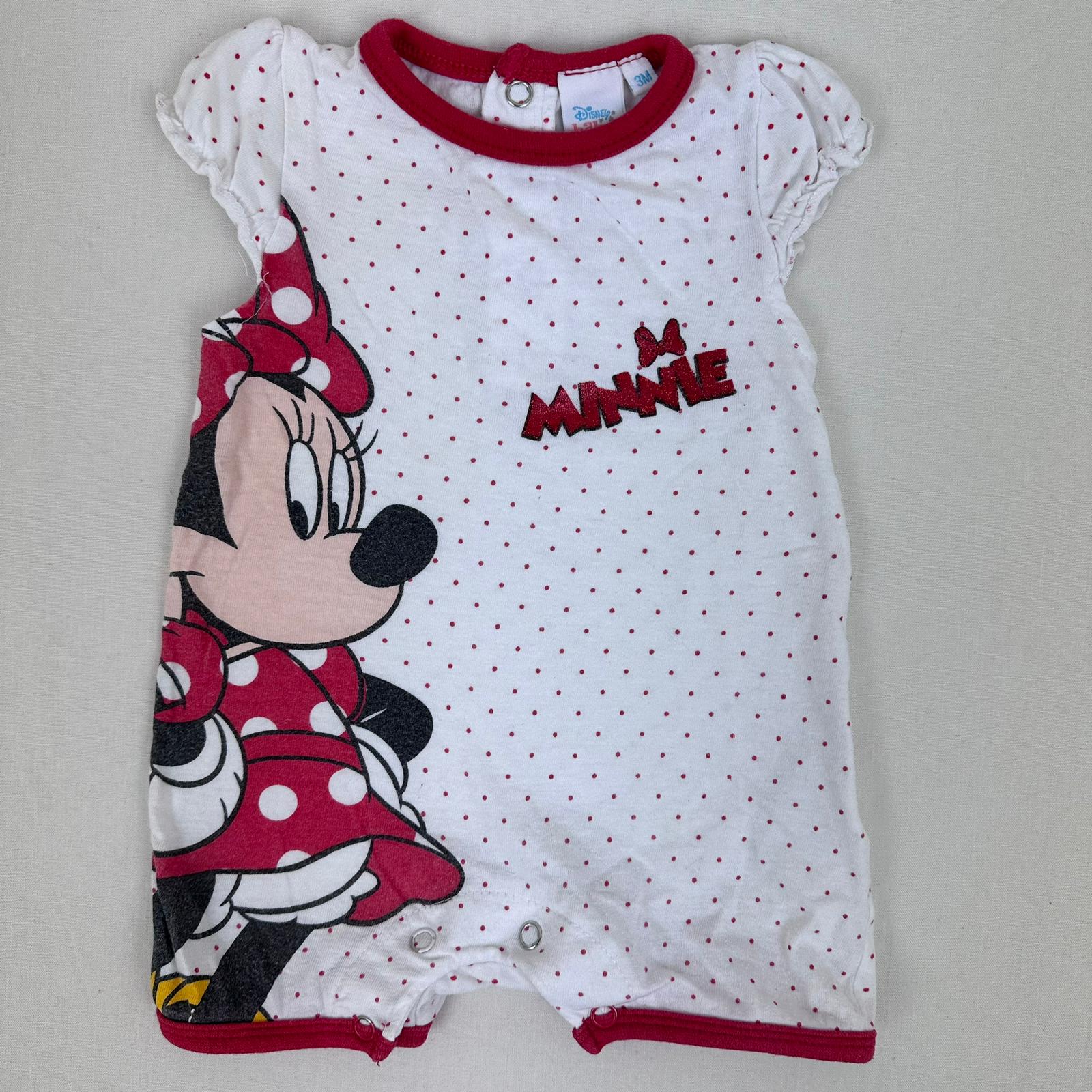Autres commentaires : Combicourt blanc manches courtes avec des points rouges et comme motif Minnie et une fermeture par boutons pressions au dos.