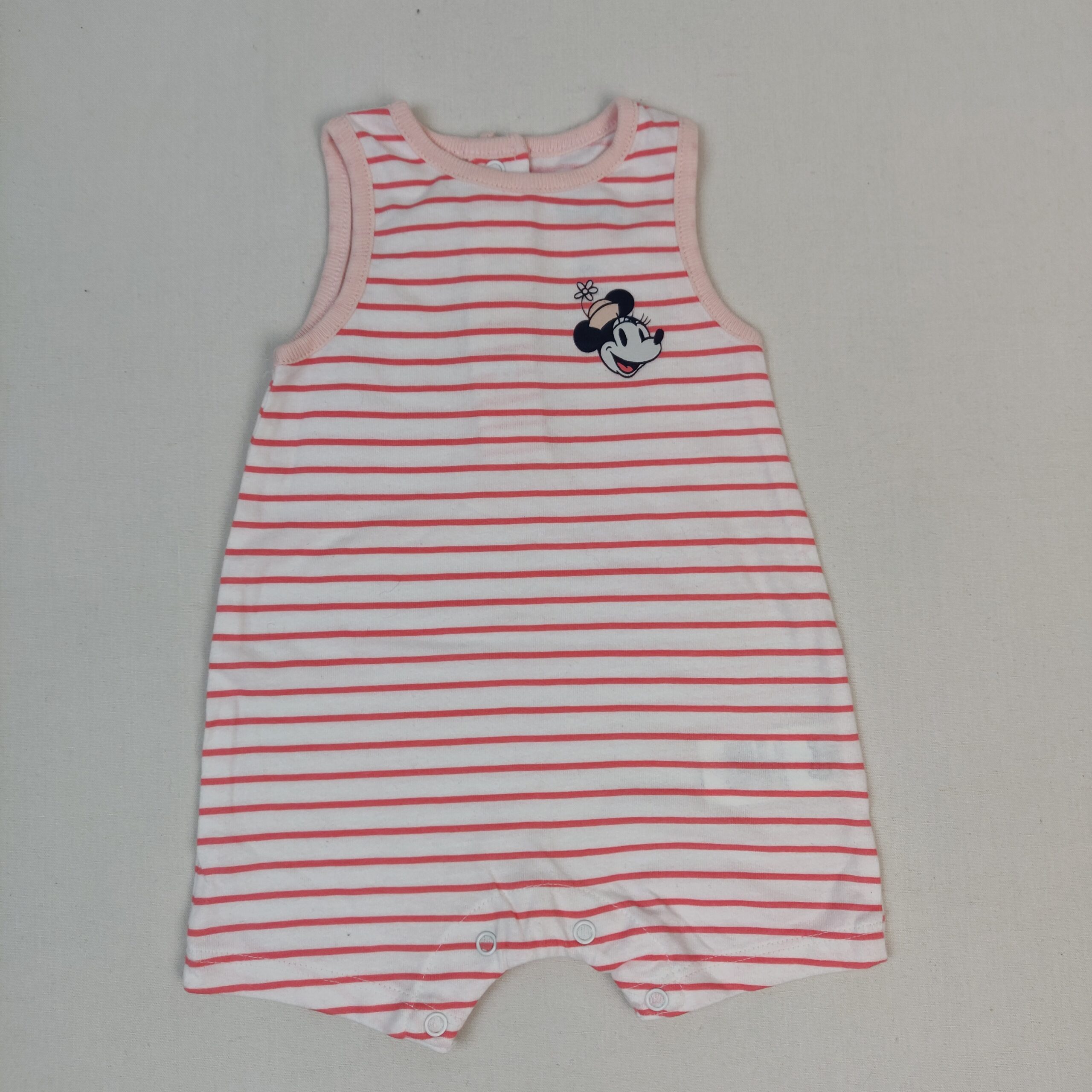 Autres commentaires : Combicourt sans manches, blanc à rayures rose corail, col rond et emmanchures rose pâle, motif tête de Minnie avec chapeau rose orné d’une marguerite, fermeture en haut du dos et à l’entrejambe par boutons pression.