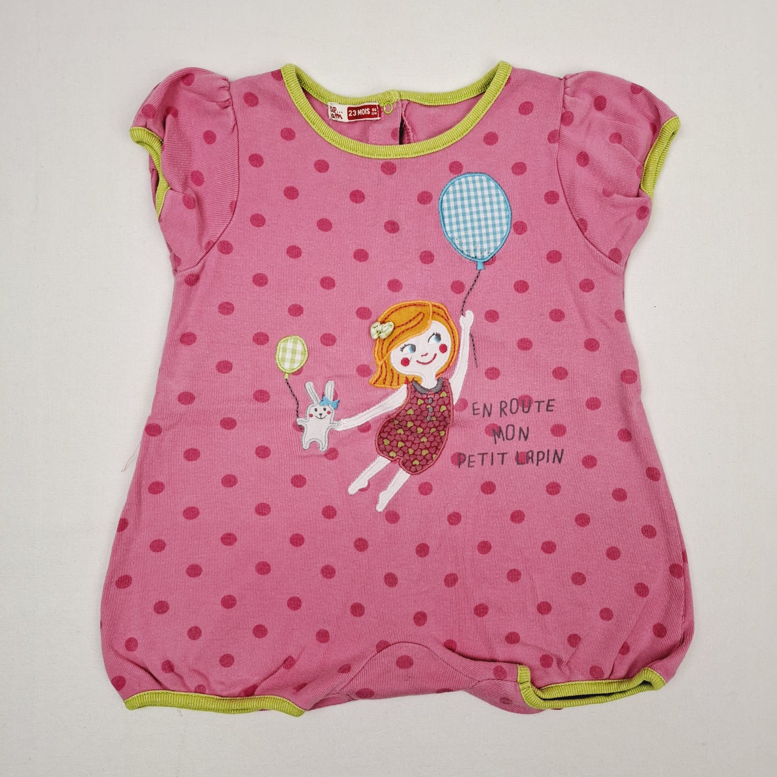 Autres commentaires : Combicourt rose à pois rose foncé à manches courtes, col rond, motif fille et inscription « En route mon petit lapin », fermeture par bouton pression au dos