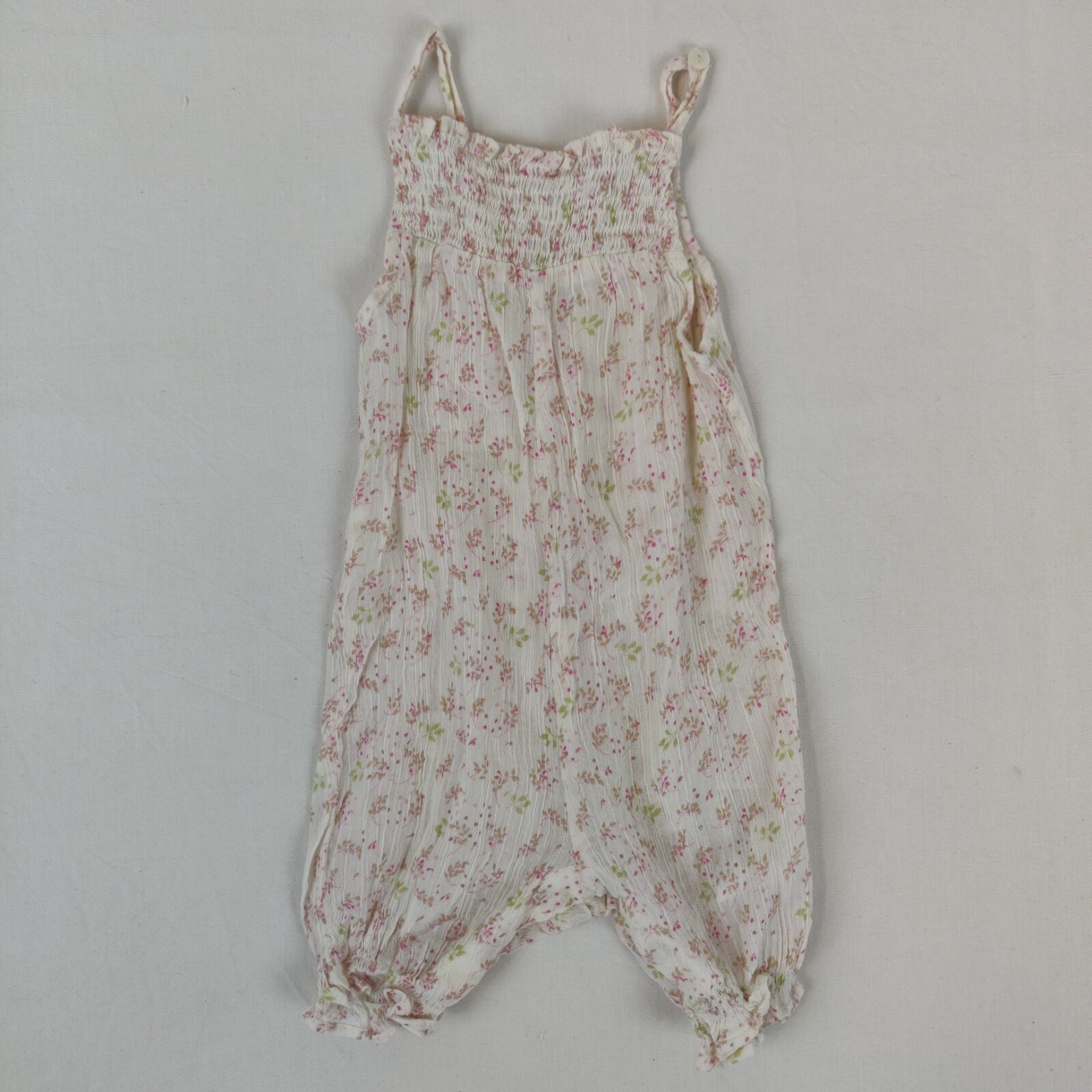 Autres commentaires : Combicourt à fines bretelles en crèpe beige à motifs floraux roses, marrons et verts. Ouverture pressionnée à l’entrejambe.