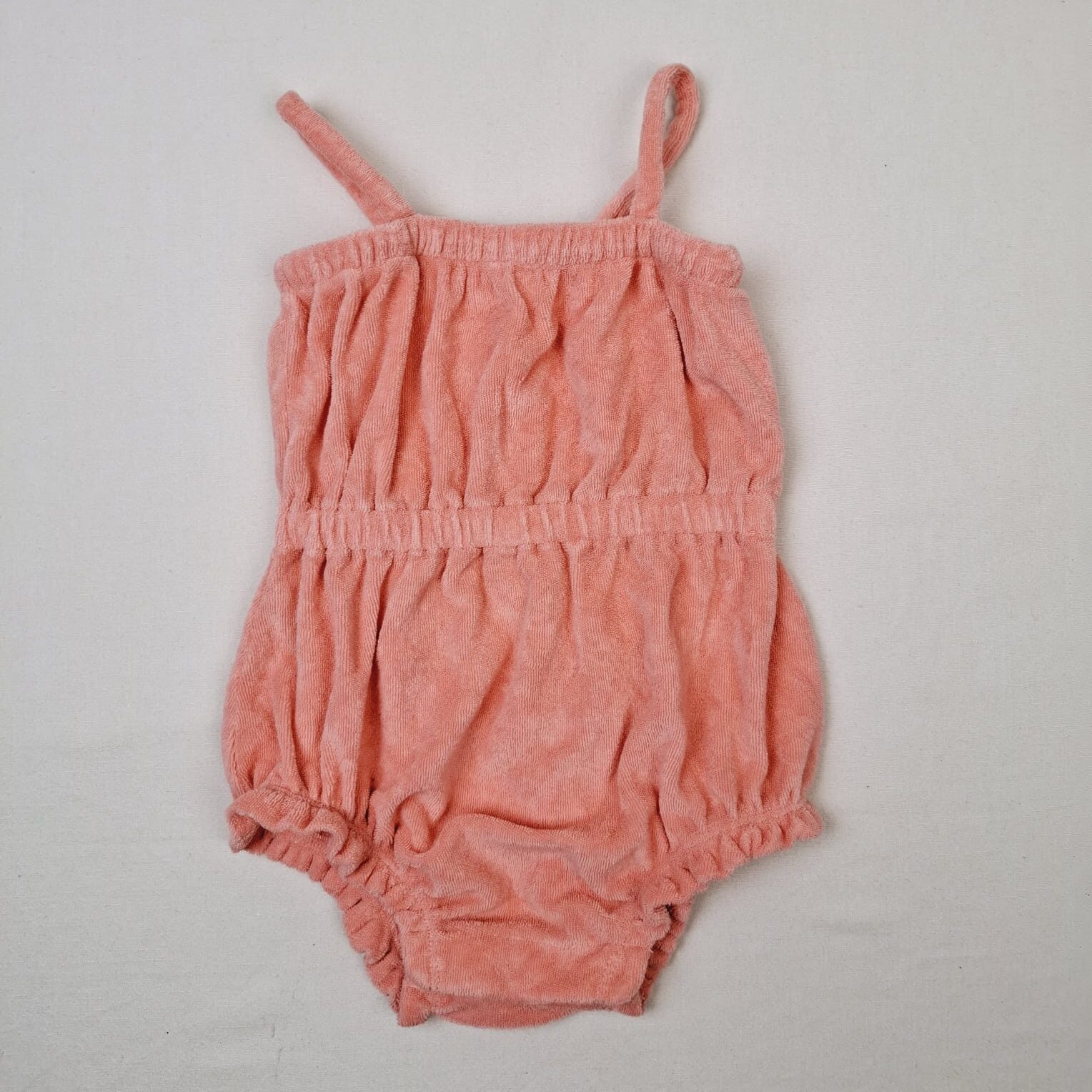 Autres commentaires : 16% polyester. Combinaison rose saumon éponge à bretelles fines, taille élastiqué, fermeture au niveau des cuisses élastique avec effet bouffant.