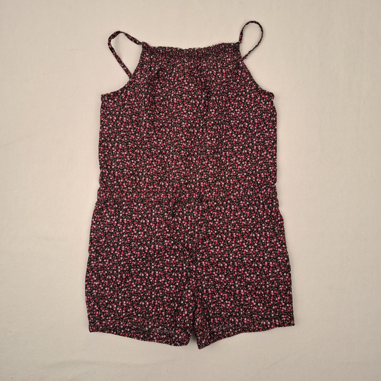Autres commentaires : Combicourt noir à bretelles avec des motifs de fleurs roses, fermeture par boutons au dos, fermeture au niveau des cuisses élastique avec effet bouffant, col élastique à l’avant.