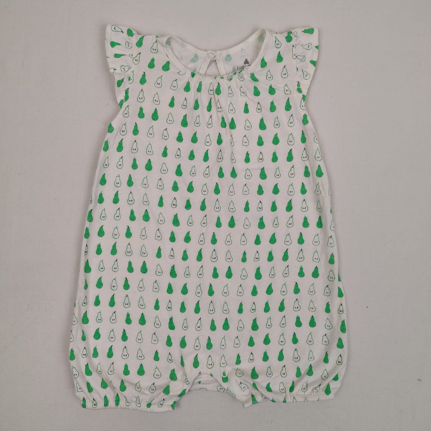 Autres commentaires : Combicourt sans manches blanc cassé, style barboteuse, motifs mini poires vertes, petits volants sur les épaules, fermeture par un bouton en haut du dos et par boutons pression à l’entrejambe, élastiqué au niveau des cuisses.