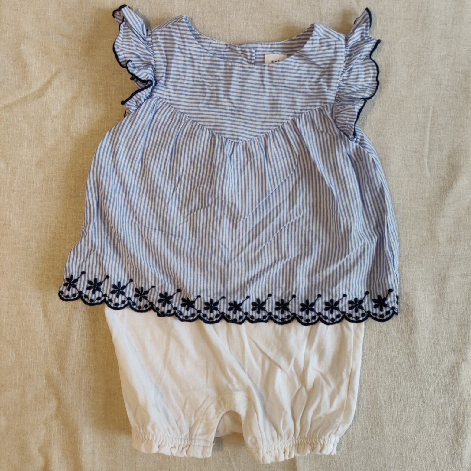 Autres commentaires : Combinaison courte effet chemisier et short : haut col rond manches courtes à volants, bleu et blanc rayé avec bordures brodées de fleurs bleu marines, fermeture au cou, et mbas intégré sous forme de bloomerblanc en jersey de coton, fermé à l’entrejambe par boutons pression