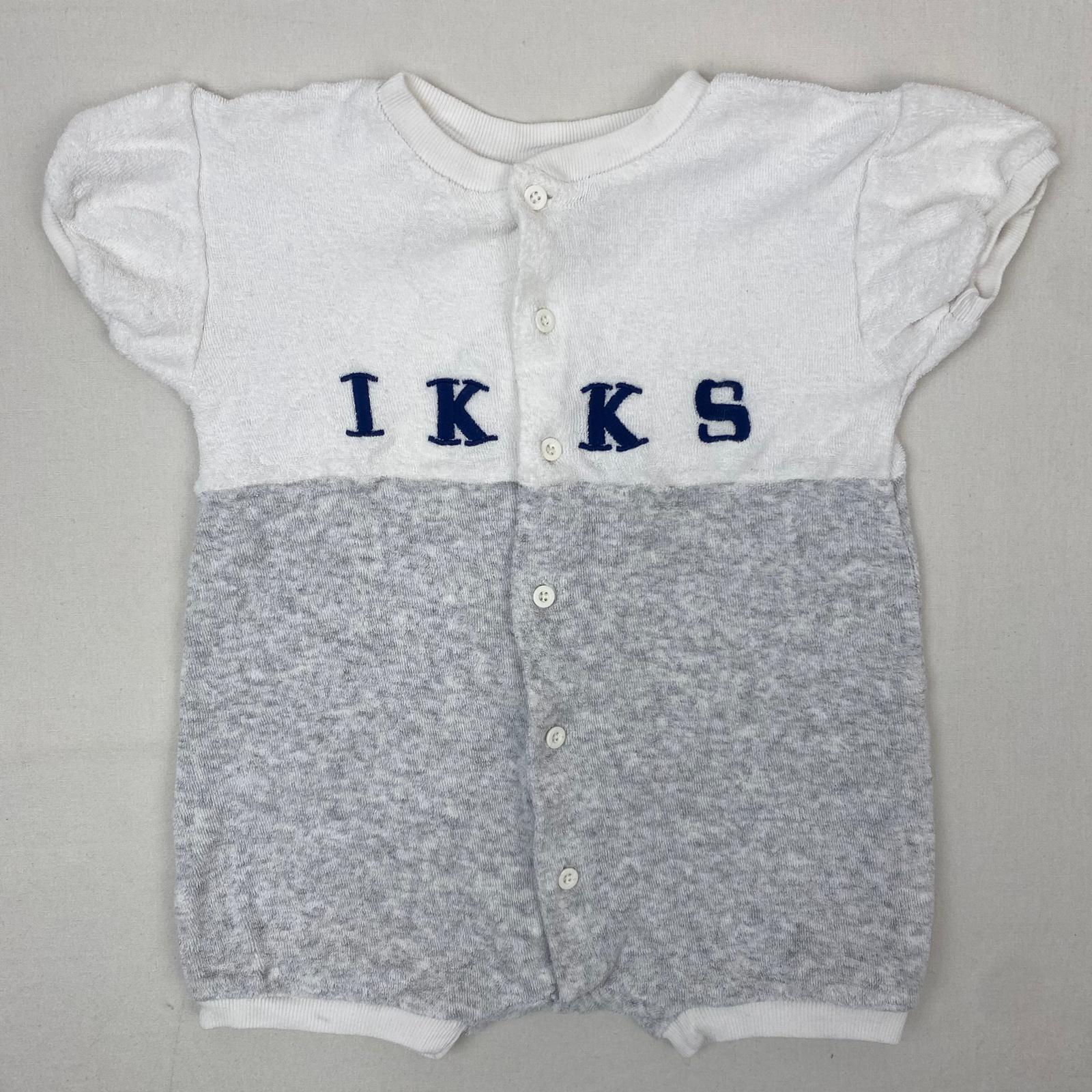 Autres commentaires : Combicourt blanche et grise avec une inscription « IKKS » au centre, col rond, fermeture par boutons.