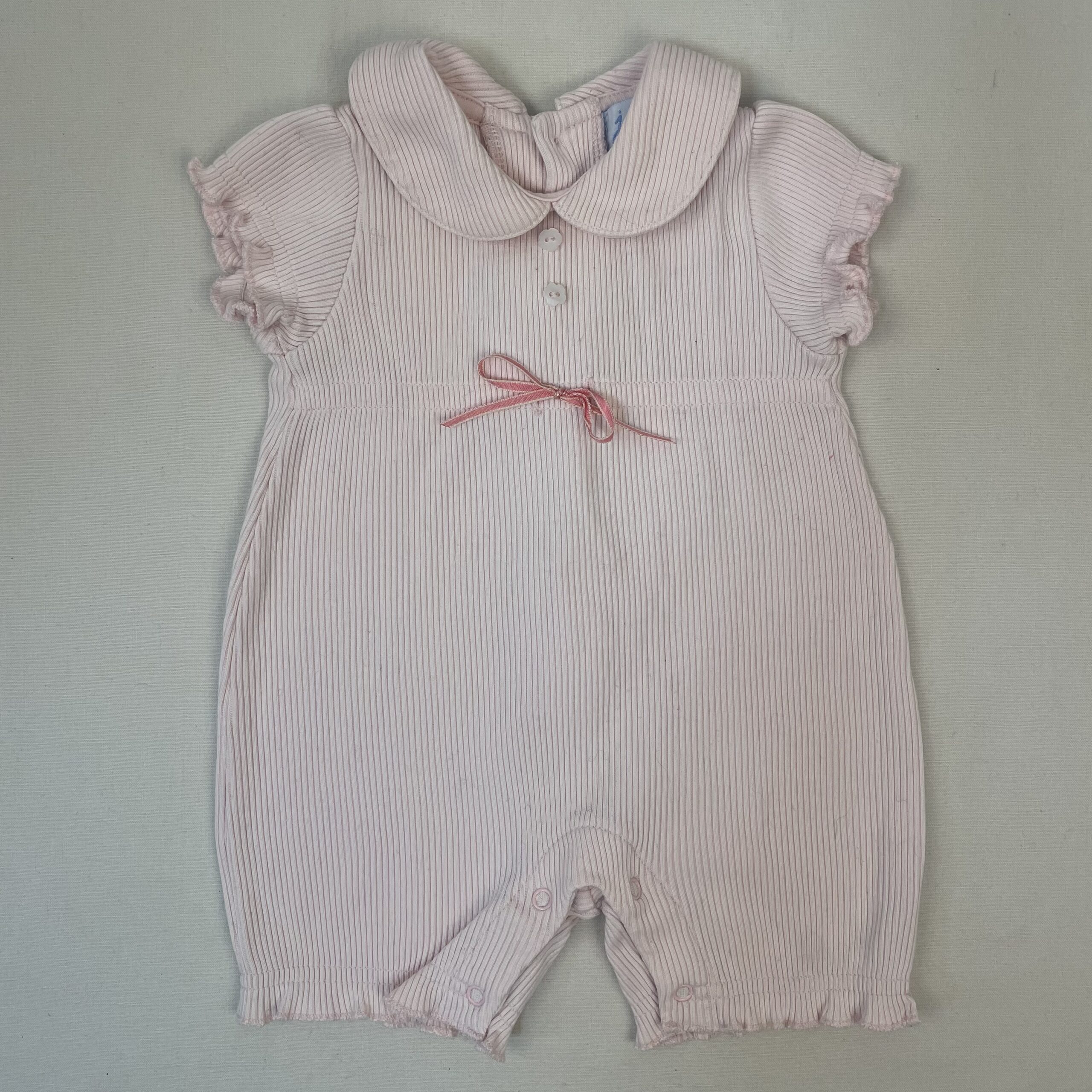- Combicourt rose pâle en coton côtelé, fermeture au dos par petits boutons et à l’entrejambe par boutons pression, col Claudine.