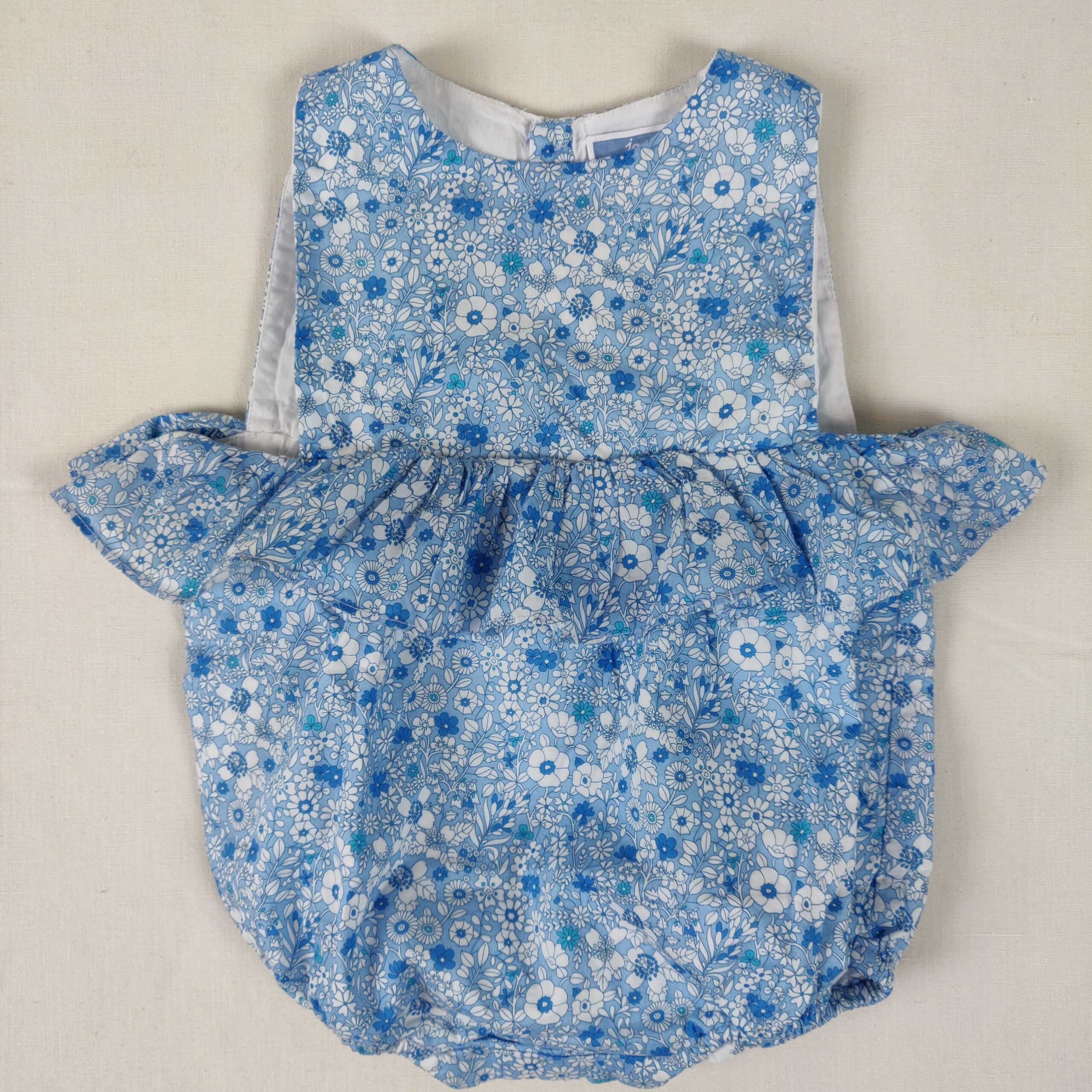 Autres commentaires : Barboteuse sans manches en liberty blanc et bleu, type chasuble, petit volant à la taille. Fermeture par 3 boutons nacrés au dos et boutons pression à l’entrejambe. Entièrement doublée en blanc.