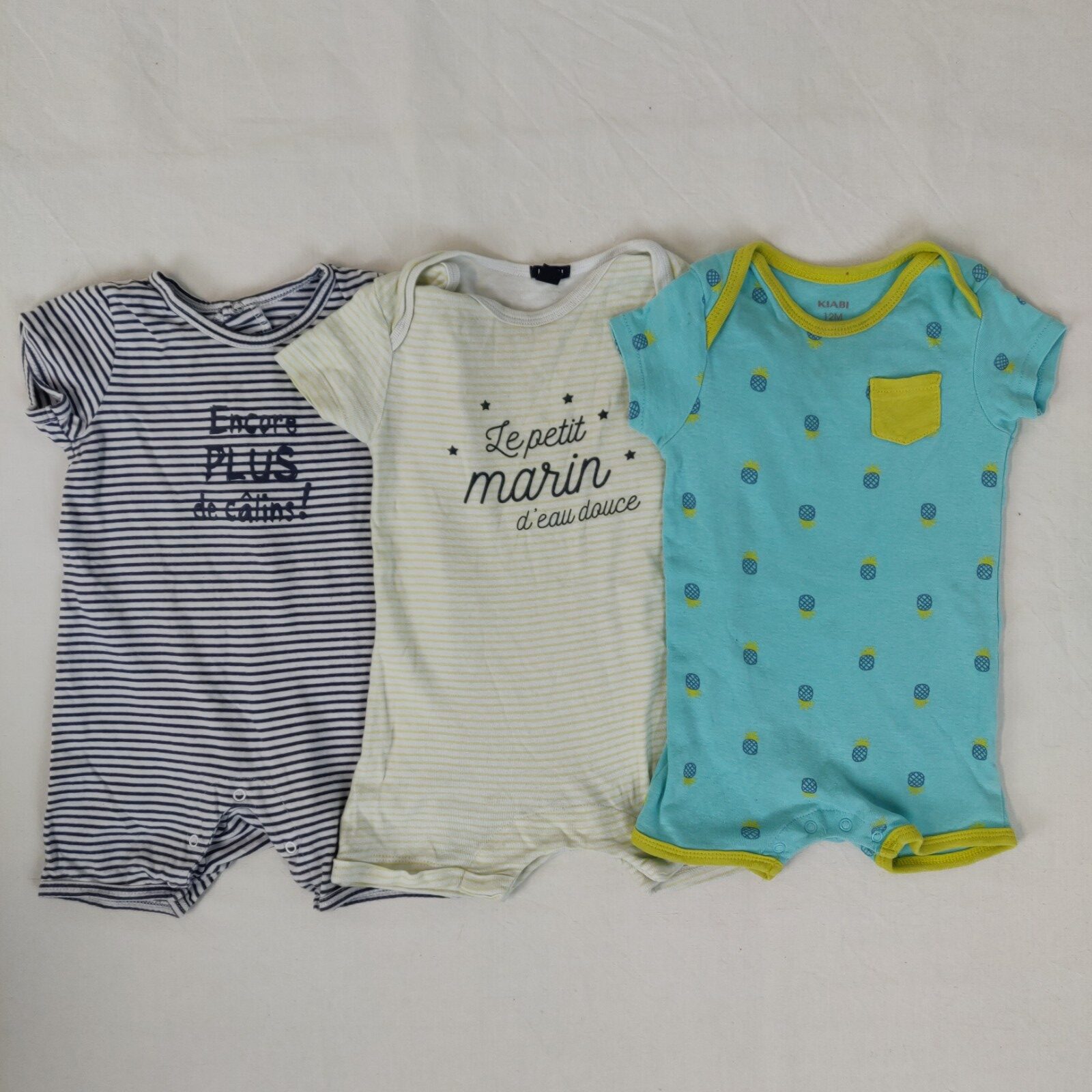 Autres commentaires : 3 combicourt manches courtes bleu,jaune et une bleu foncé contenant une fermeture par bouton pression au dos.
