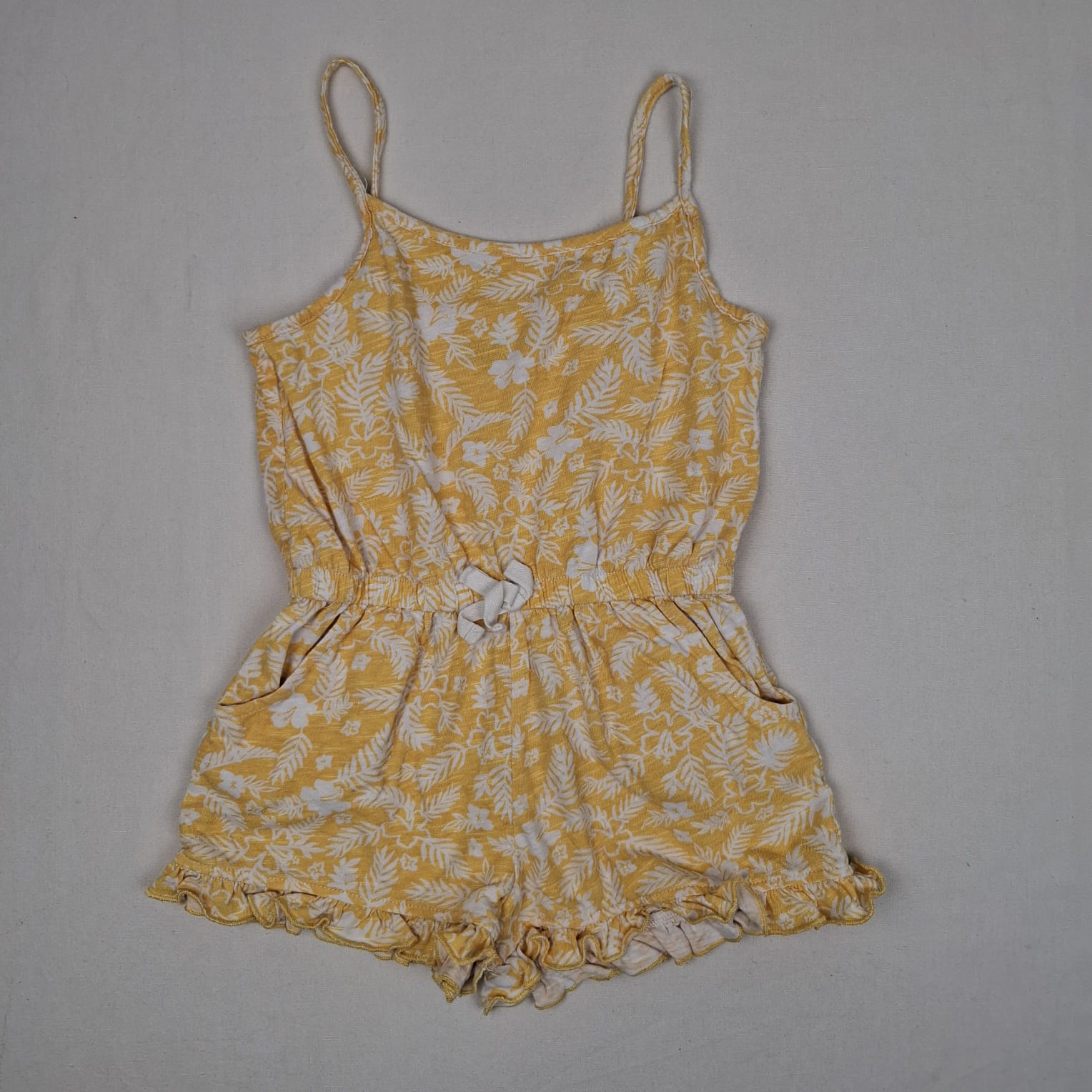 Autres commentaires : Combi-short à bretelles, jaune et blanche, taille élastiquée avec cordon blanc, jambes élastiquées, gamme eco conception (100% coton biologique)