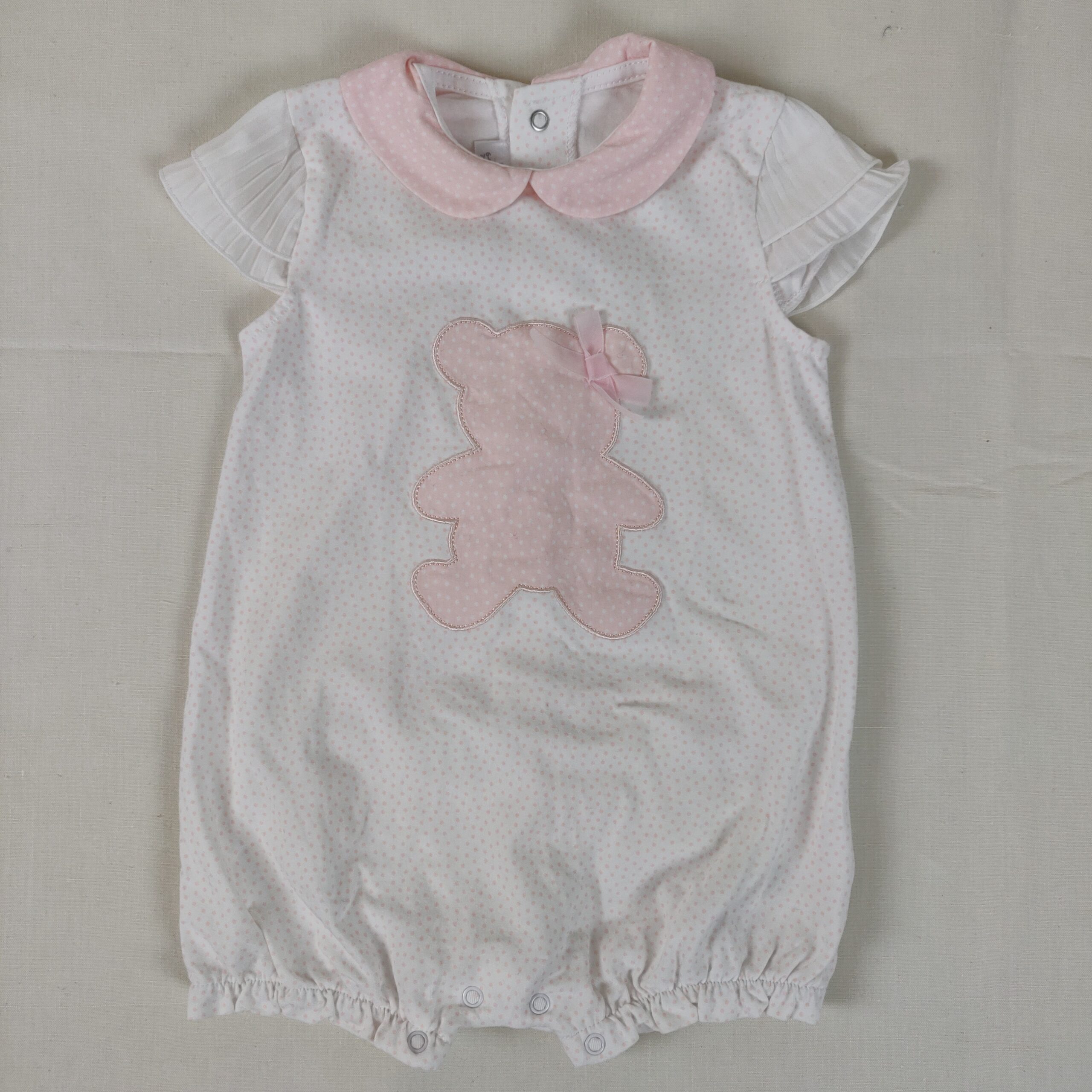 Autres commentaires : 6% elasthanne. Très jolie barboteuse en parfait état, points pois roses pâle sur fond blanc, col claudine et ours brodé à pois blancs sur fond rose. Manches courtes volantées, froufours aux fesses, petit noeud rose à l’oreille de l’ours. Très belle facture.