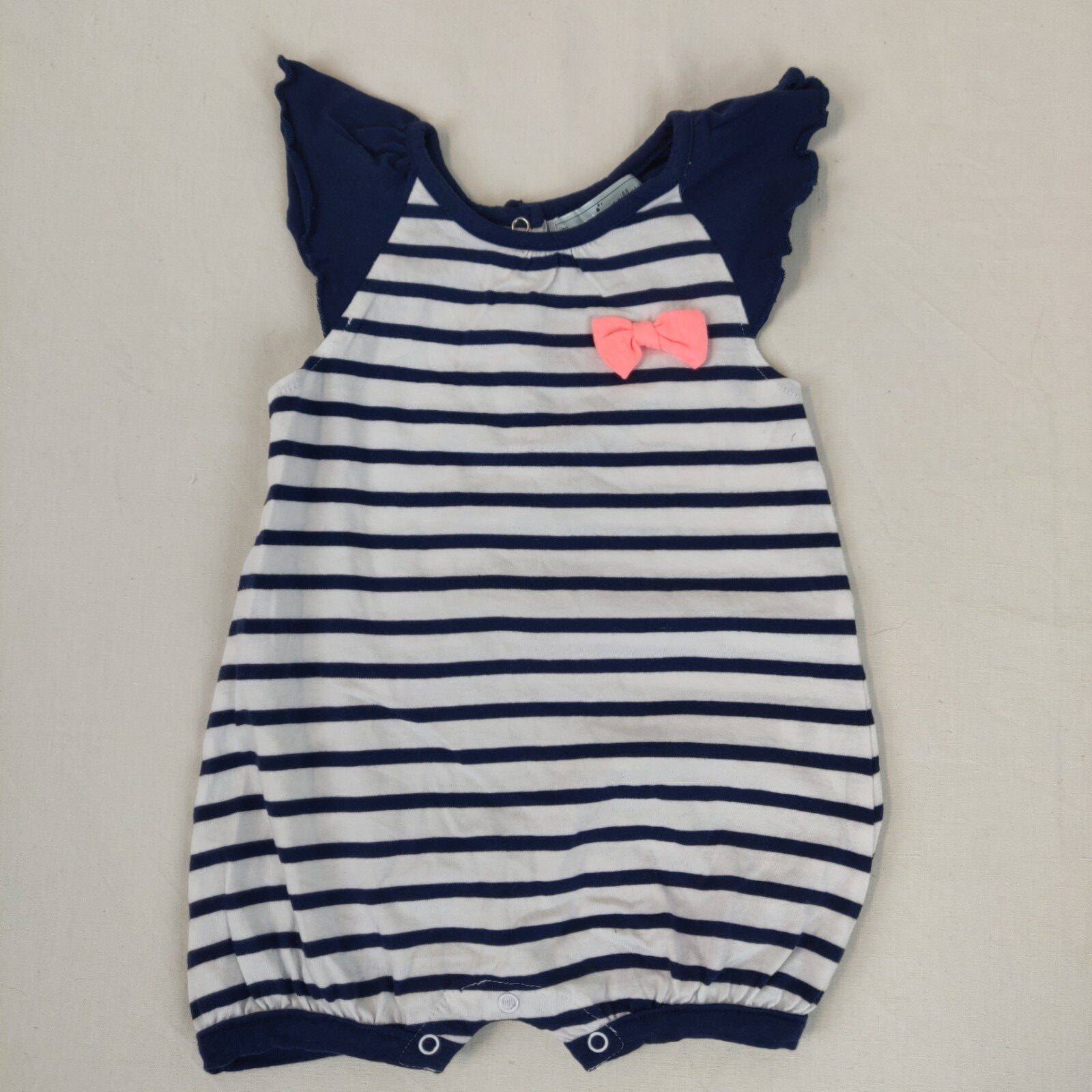 Autres commentaires : Combi-court à très courtes manches bleu marine – blanc rayé bleu marine. Noeud central rose fluo. Ouverture à l’entrejambe à pressions. Ouverture centrale au dos à pressions.