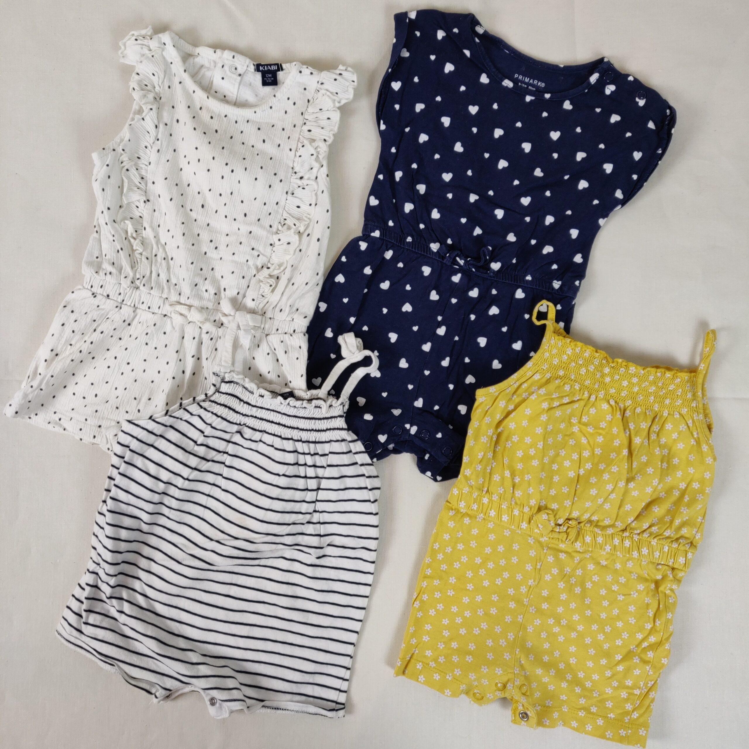 Autres commentaires : Lot de 4 barboteuses, 2 Primark et 2 Kiabi, en bon état général mais avec de petits défauts : la blanche à pois est tachée au col, la bleu marine à coeurs est rappiécée à l’entrejambe, la blanche à rauyres marines a une tache discrète dans le dos, la jaune a un petit trou rappiécé à la couture des fesses. L’ensemble est très bradé, tout à fait portable malgré ses petits défauts.