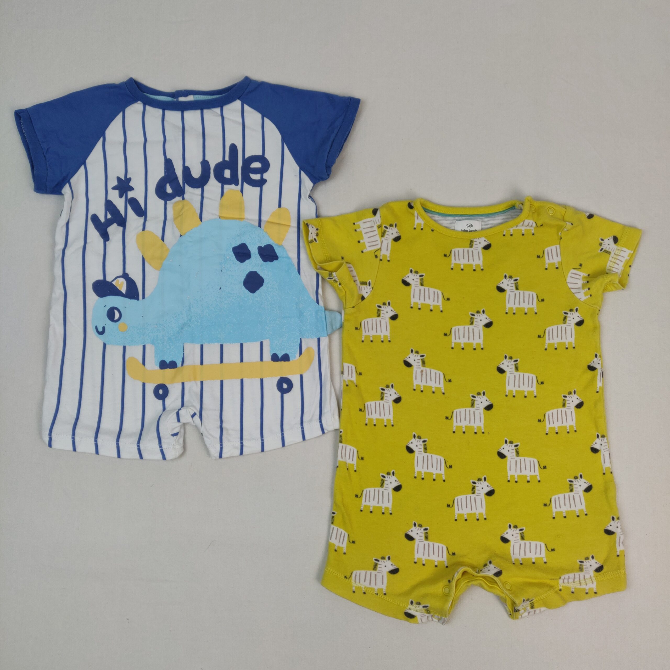 Autres commentaires : Lot de 2 combicourts manches courtes : un jaune JOHN LEWIS, motifs zèbres blancs et gris, fermeture par boutons pression à l’epaule gauche et à l’entrejambe. – un blanc à rayures bleues verticalesTEX, inscription en bleu » HI DUDE et motif central tortue, fermeture par boutons pression à l’arrière.