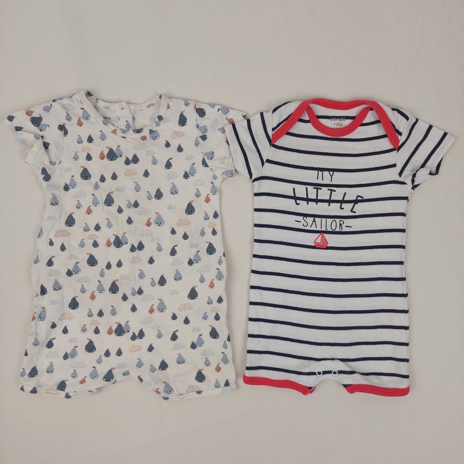 Autres commentaires : Lot 2 combishorts, un Kiabi style marinière, imprimé « MY LITTLE SAiLOR », liseré rouge, un blanc motifs poire, fermeture pressionné au dos
