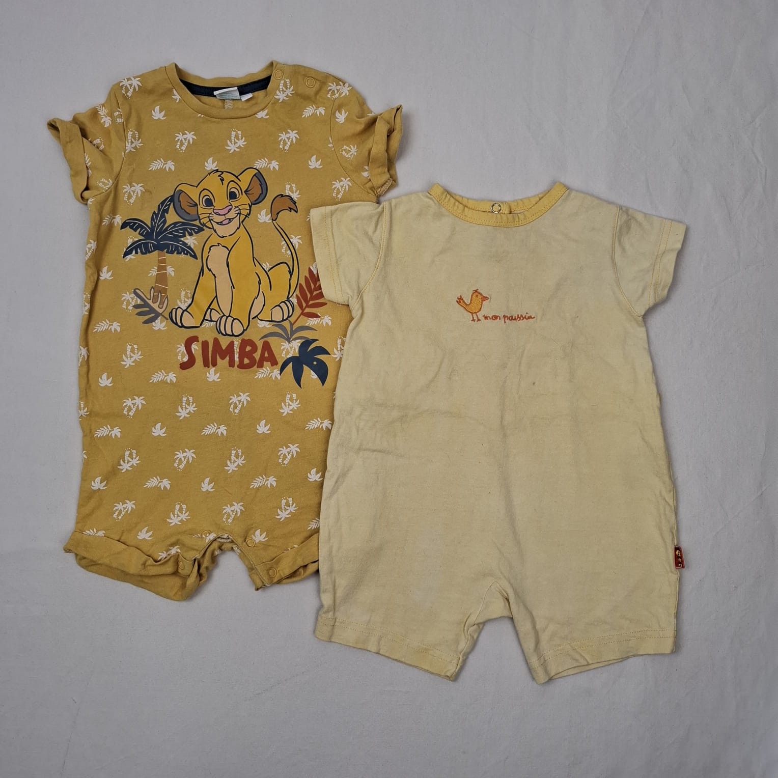 Autres commentaires : Lot de 2 combinaisons courtes à manches courtes : – une jaune claire DPAM, avec inscription ‘Mon Poussin’ cousue devant, fermeture à l’épaule et au dos par boutons pression – une jaune moutarde Baby Disney, motif roi de la jungle, inscription à l’effigie « SIMBA », fermeture par boutons pression à l’épaule ainsi qu’à l’entrejambe. Petit défaut : petite trace devant. Niveau réduit de Fraise à Myrtille.
