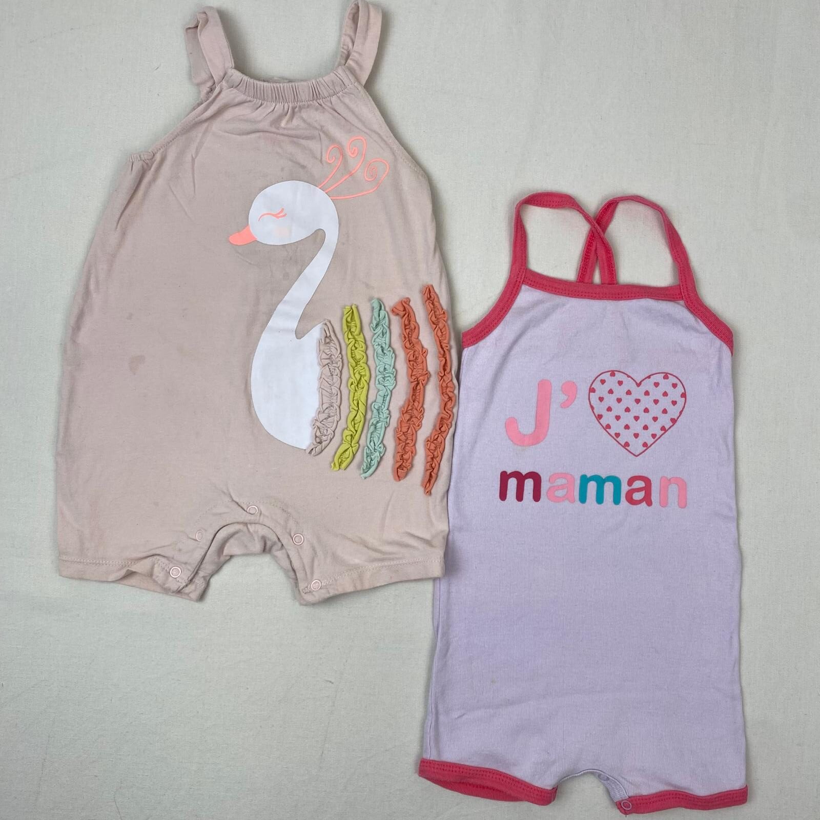 Autres commentaires : Lot de 2 combicourts sans manches : – Un Kitchoun mauve à bretelles croisées, fermeture par boutons pression à l’entrejambe, devant inscription « J’aime maman » avec un coeur. – Un Orchestra à bretelles, bleige rosé, avec devant, motif cygne blanc avec des bandes froncées de tissu de couleur, fermeture au dos et à l’entrejambe par boutons pression, élastiqué au niveau du col et du dos (23 mois équivalent 18M).