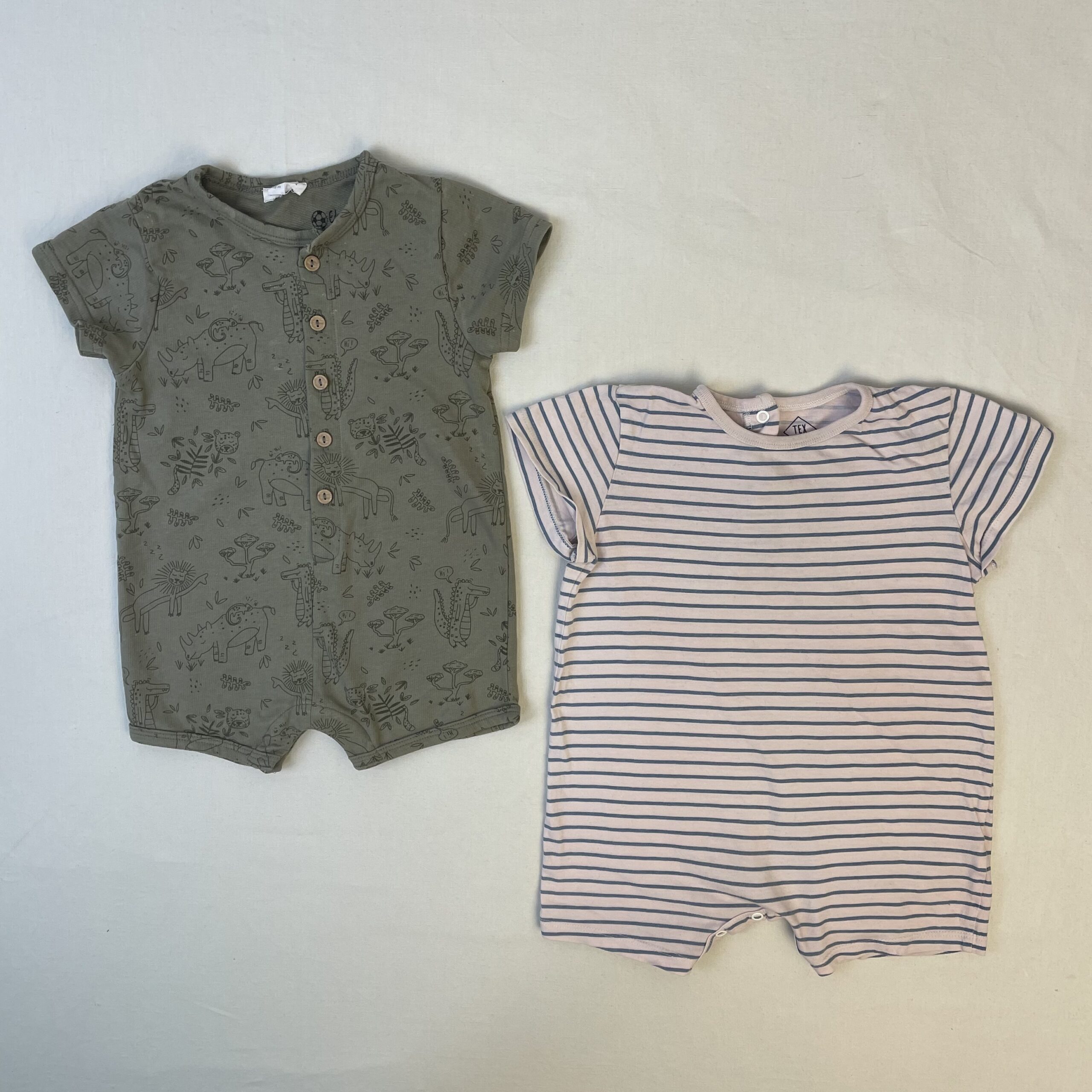 - Lot de 2 combicourtes manches courtes: kaki de marque Vertbaudet, fermeture par boutons classiques devant et par boutons pressions entre les jambes, motif animaux; rose pâle à rayures bleues de marque TEX baby, fermeture par boutons pressions au dos et entre les jambes.