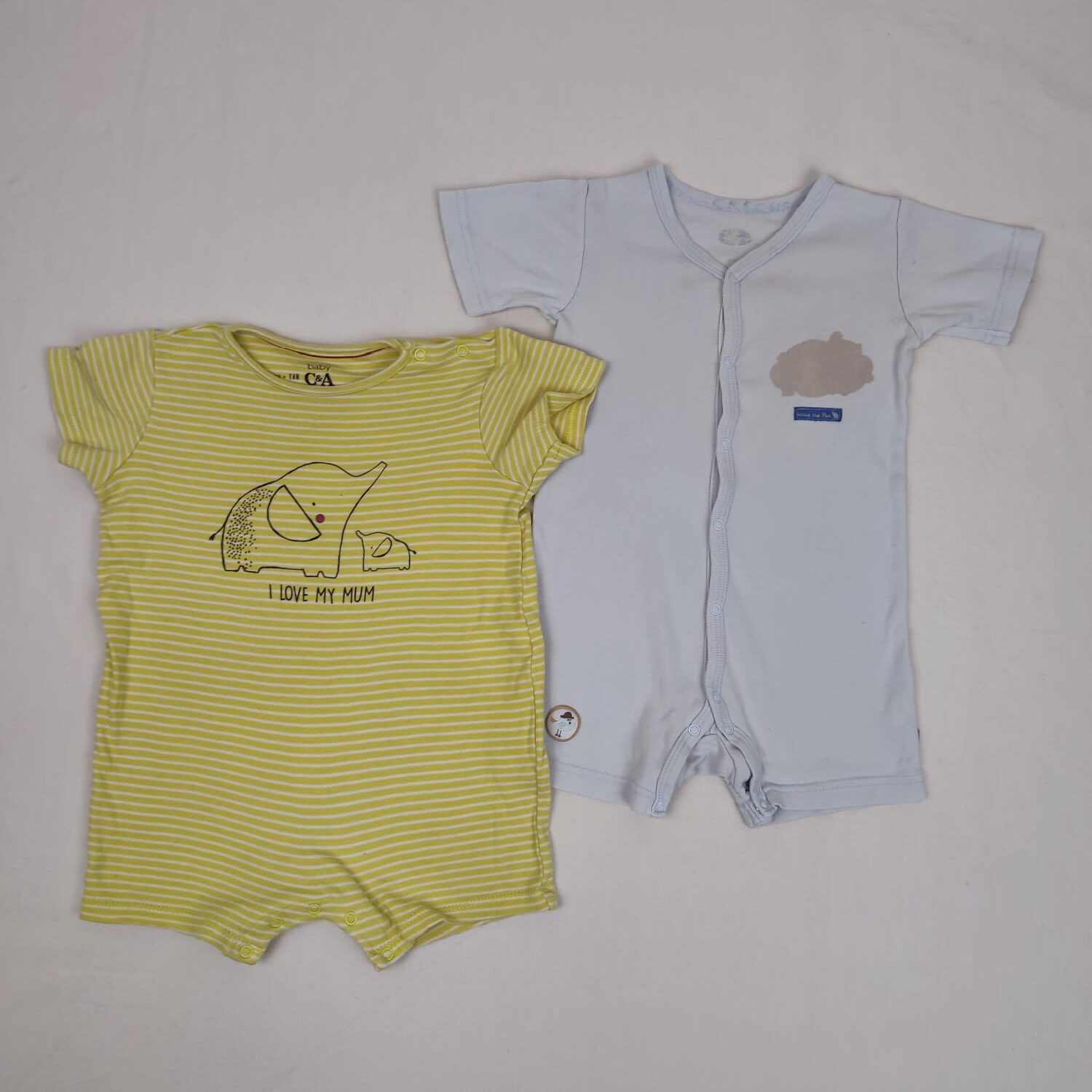Autres commentaires : Lot de 2 combicourts : – un jaune à rayures blanches C&A, motif éléphante et son éléphanteau, col rond, inscription « I love my mum ». – un bleu très pâle Tex, col v, inscription « Winnie the pooh ». Petit défaut : petite tache sur la manche gauche. Niveau réduit de Fraise à Myrtille.