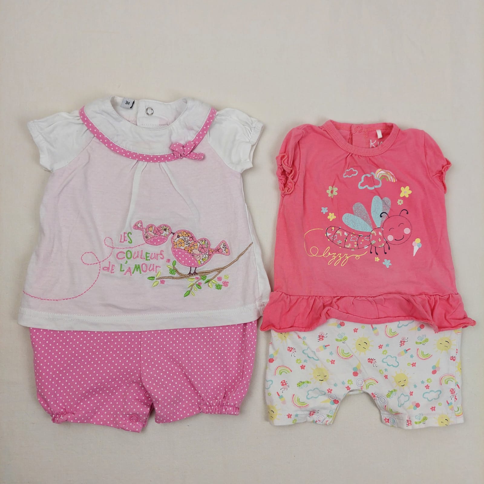 Autres commentaires : Combicourt Kimbaloo rose avec short intégré multicolore, combishort sans marque blanc avec short rose, inscription les couleurs de l’amour. Les 2 sont boutonnés au dos et à l’entrejambe par boutons presson